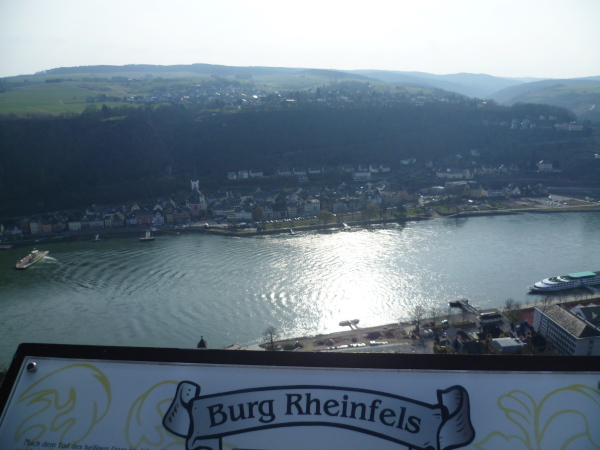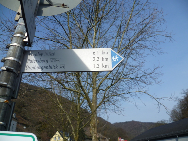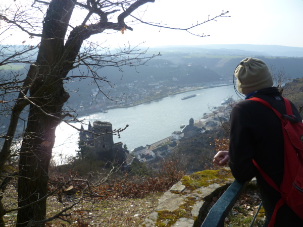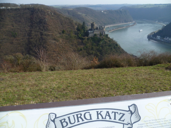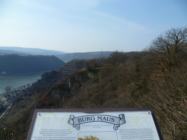 Wir sind in St. Goarshausen, auch Loreley-Stadt genannt. Ein Schild sagt dass es noch 6 km bis Loreley sind. Eine Treppe bringt uns wieder bergauf auf den Rheinsteig. Am Aussichtspunkt "Drei Burgenblick" machen wir kurze Rast. Nach hinten kann man die Burg Maus erkennen. Gegenüber am anderen Rheinufer liegt die mächtige Burgruine Rheinfels im nachmittäglichen Dunst. Und nach vorne kann man bereits Burg Katz am Hang liegen sehen.