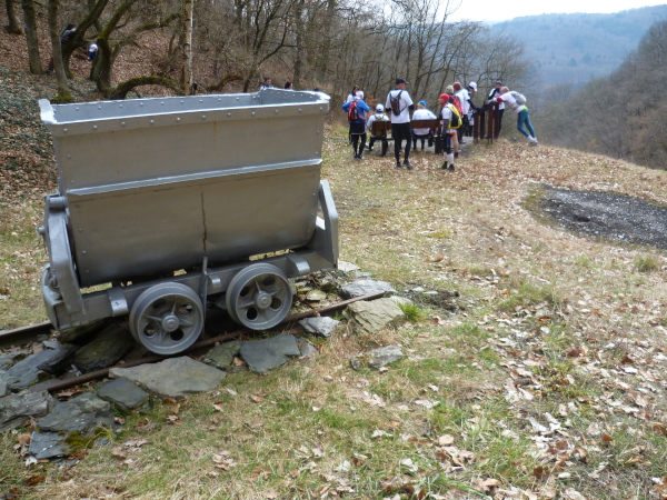 Nach dem nächsten Anstieg bei km 20 machen wir eine Pause. Hier ganz in der Nähe muss der Eingang zur Grube Gute Hoffnung sein, einer alten Blei-Zink-Erzgrube. Eine perfekt restaurierte Lore symbolisiert den jahrhundertelangen Erzabbau in dieser Gegend. Vereinzelt sind noch Mundlöcher oder Abraumhalden in den Wäldern zu finden.