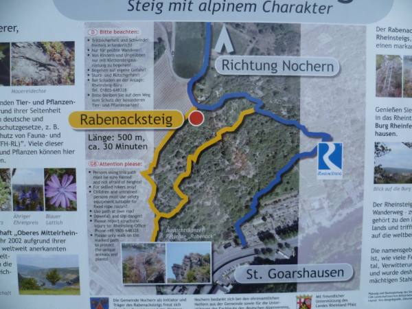 Zwei Kilometer weiter machen wir halt. Gerade wollten wir einen kleinen Pfad bergab laufen, da macht uns ein großes Schild auf den Klettersteig aufmerksam. Auf 500 m Länge kann man den Rabenack, einen imposanten Felsen über St. Goarshausen ersteigen. Der Raabenacksteig ist mit Leitern und Stufen versehen und mit Stahlseilen gesichert.