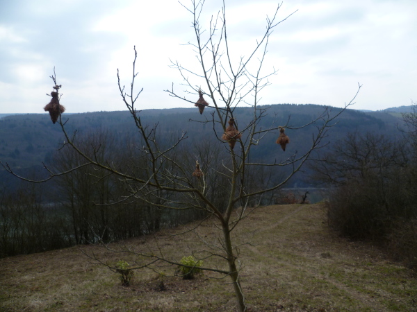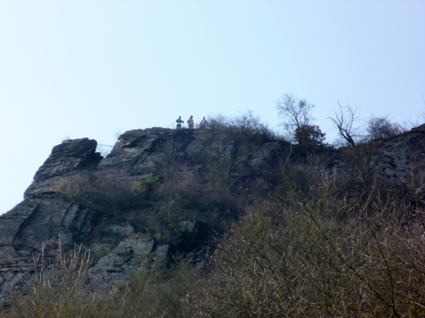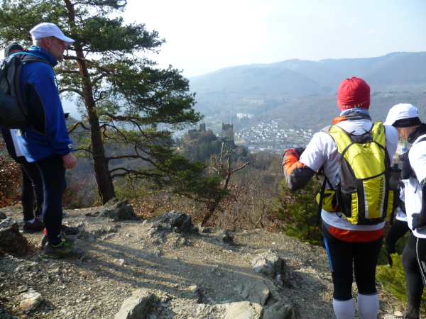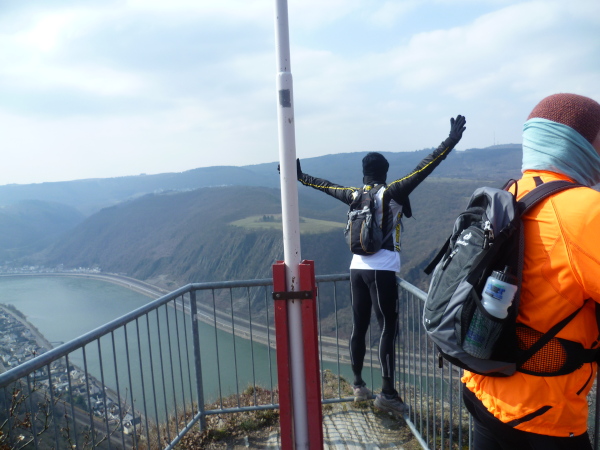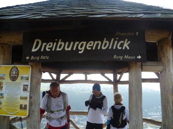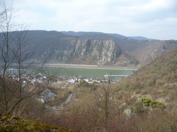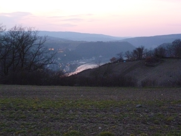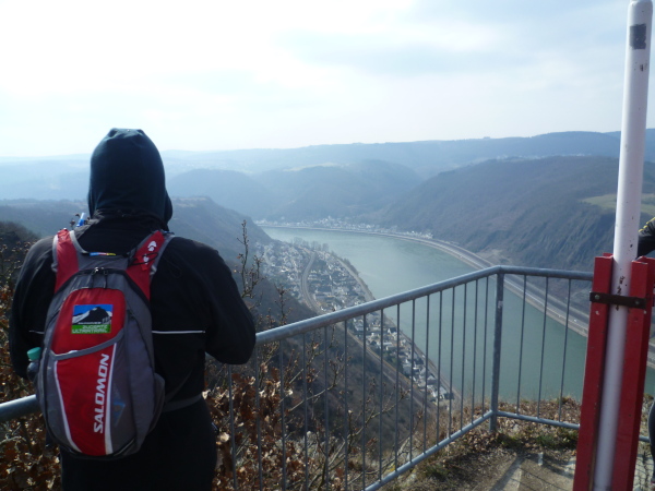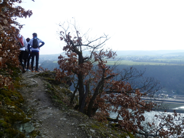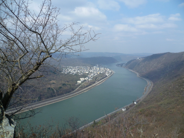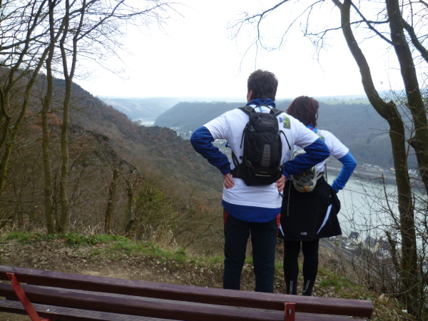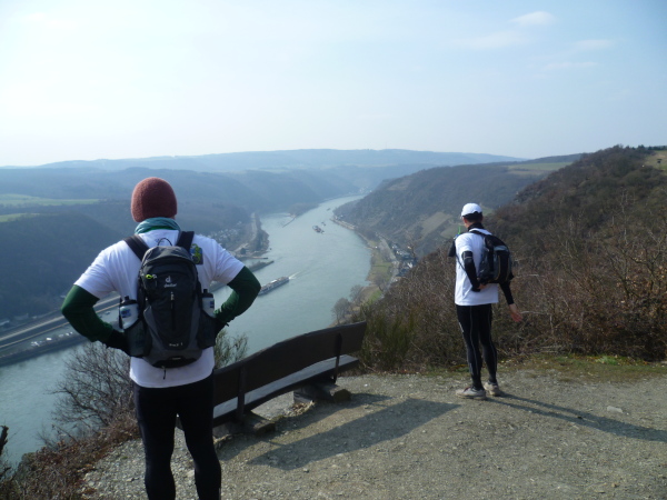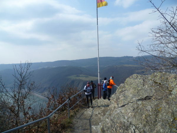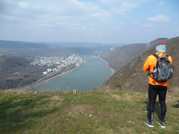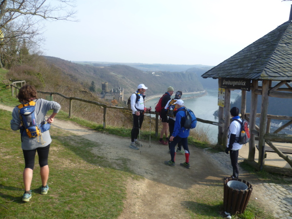 Bald sind alle satt und zufrieden. Es kann weiter gehen. Wir laufen auf einer Hochebene bis sich unvermittelt der Blick weitet: der Aussichtspunkt Hindenburghöhe bietet ein wunderbares Panorama: Blick zurück mit dem Rhein, Bad Salzig auf der gegenüberliegenden Rheinuferseite und den feindlichen Brüdern im Hintergrund; Blick nach vorne mit dem kleinen Ort Kestert und einer langgezogenen Rheinschleife.