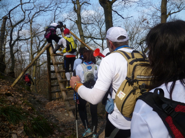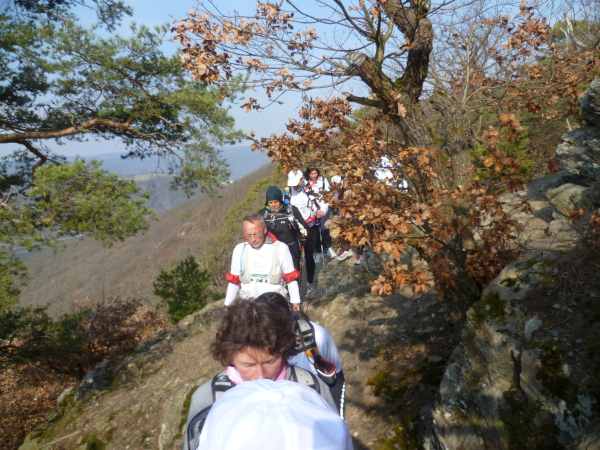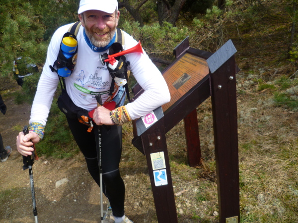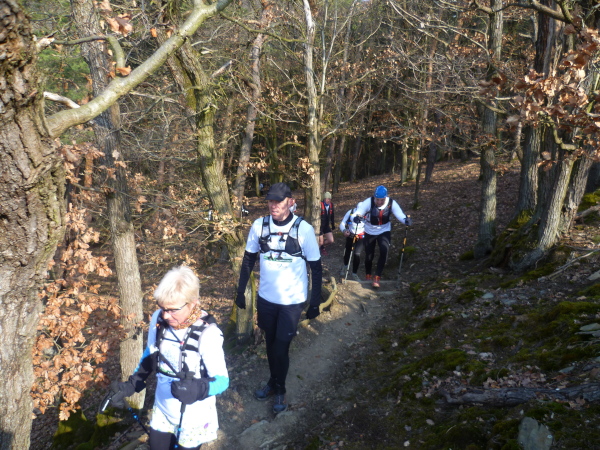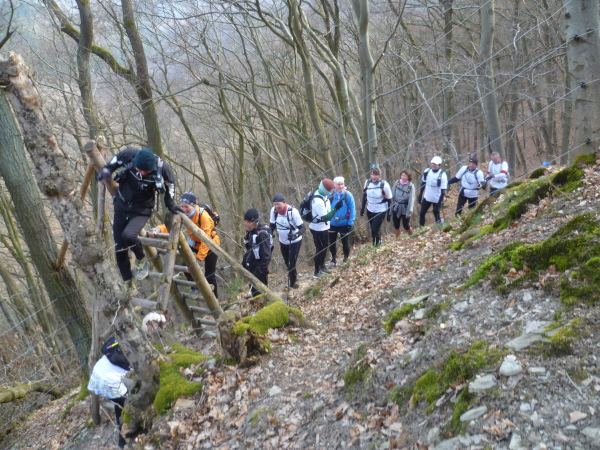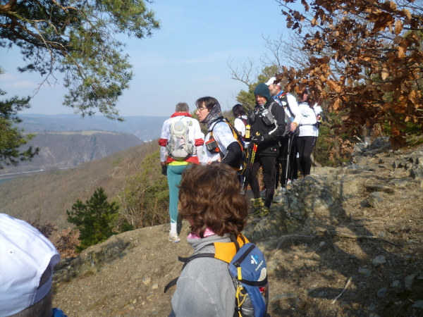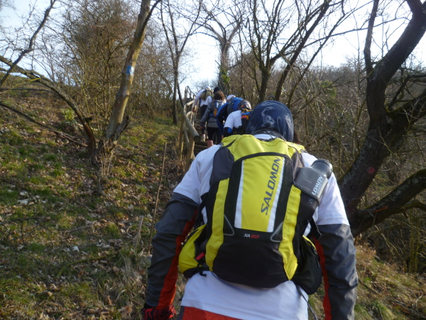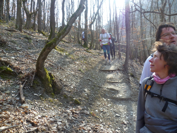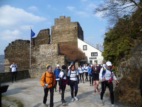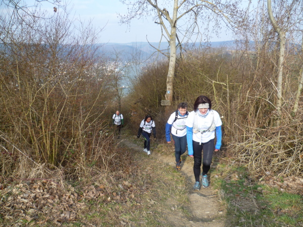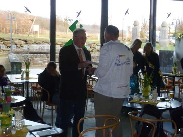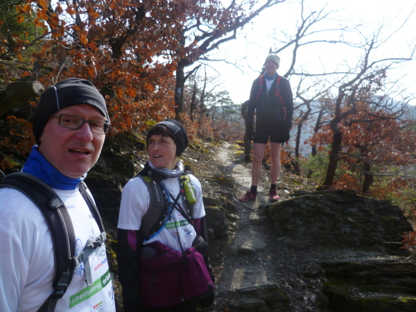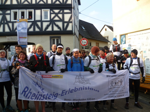Es gibt auch richtige Wanderer auf dem Rheinsteig. Als große Gruppe fallen wir natürlich auf. Vor allem, wenn wir im Laufschritt unterwegs sind. So oft es geht, informieren wir interessierte Wanderer über unsere Veranstaltung. Rolf hat immer Visitenkarten dabei. Manchmal kommt es hierbei zu spontanen Spenden, die dann direkt unserer Spendenkasse zugefügt werden.