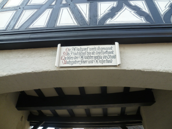 Punkt 8 Uhr 30 versammeln wir uns vor dem Hotel. Das historische Wachportal ist mir gestern nicht aufgefallen. Es wurde renoviert und ist seit kurzem ohne Baugerüst. Zwei Laufkollegen sind bereits dabei, die Fahne des Rheinsteig-Erlebnislaufs zu entfalten.