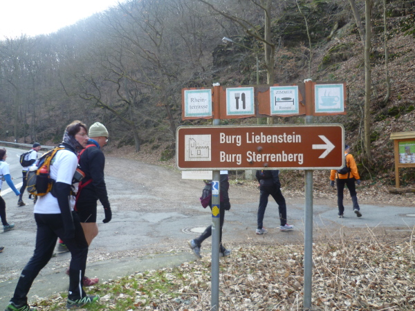 Ein Schild weist den Aufstieg zu den "feindlichen Brüdern" Burg Sterrenberg und Burg Liebenstein. Burg Liebenstein mit dem 17 m hohen gotischen Wohnturm aus dem 14. Jahrhundert liegt etwa 30 m oberhalb der Burg Sterrenberg auf einem Bergfels. Sie bietet einen herrlichen Blick über das Rheintal, sowie auf den Hunsrück und den Taunus.