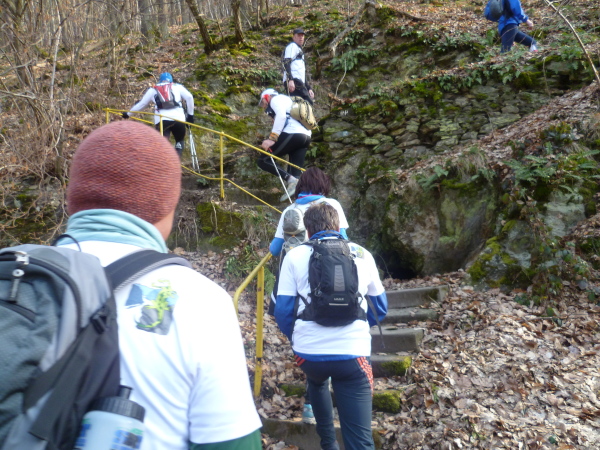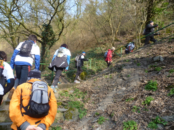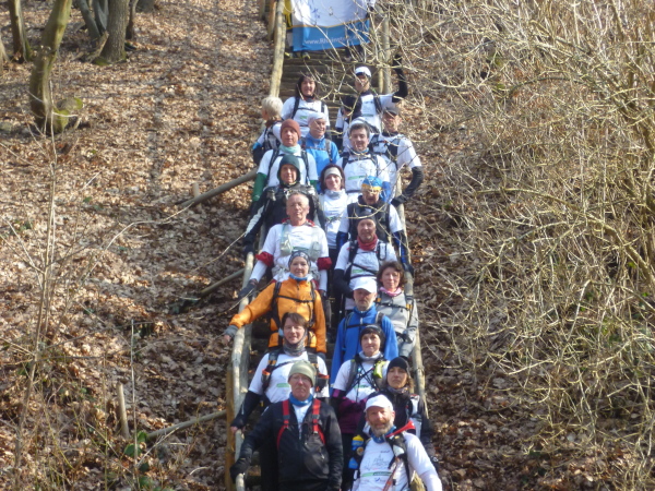 Nach ca 8 km geht es plötzlich steil bergab. Der Weg endet in einer langen abfallenden Treppe. Hier wird traditionell ein Fotostopp eingelegt. Die Gruppe stellt sich auf der Treppe auf, die Fahne wird gehisst. Alle mal lachen. Und weiter geht es.