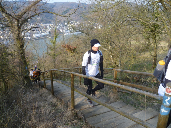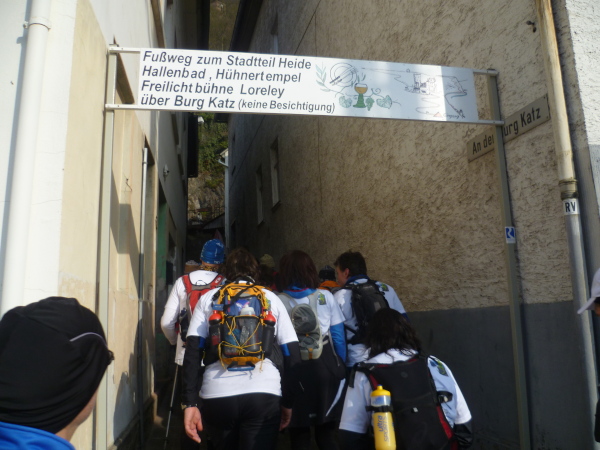 Jetzt geht es aber erst einmal wieder bergab bis St. Goarshausen. Das waren jetzt 4 Kilometer steil bergauf und steil bergab. Am Rhein entlang wären es so ungefähr 500 m gewesen. Dafür geht es nun zum letzten Mal bergauf. Zunächst sind unzählige Treppen zu bewältigen. Dann die gewohnten schmalen Pfade. Auf 1,5 km gewinnen wir 170 hm. Nicht nur ich bin platt. Hinter einem Fußballplatz sammeln wir uns ein letztes Mal. Gemeinsam erreichen wir Hotel Christian oberhalb des Loreleyfelsens.