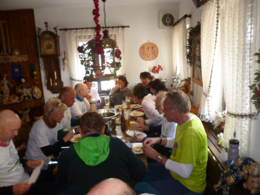 Frühstück gibt es um 7 Uhr 15. Man merkt, dass die Gruppe eingespielt ist. Die Handgriffe sind Routine. Frühstücken, Vesper vorbereiten. Koffer packen. Mit den Hotels ist abgestimmt, dass ein Teil vom Frühstück als Verpflegung eingepackt werden darf. Der Gepäcktransfer wird von den Hotels übernommen.