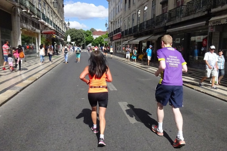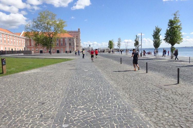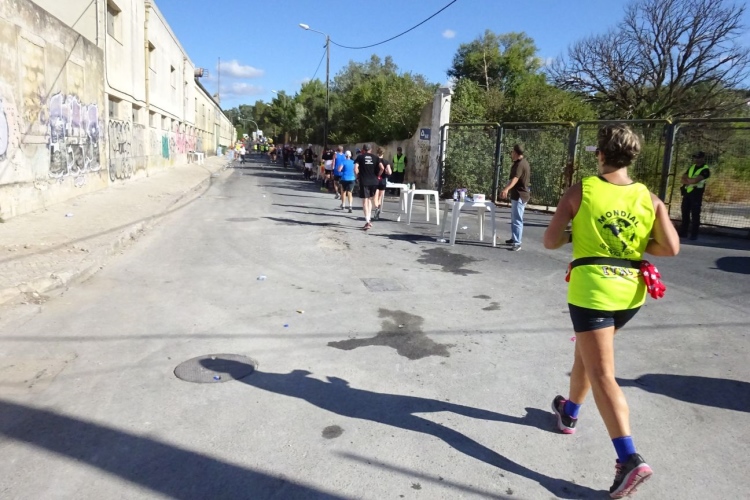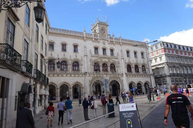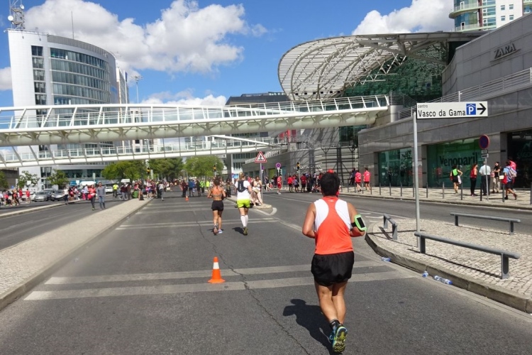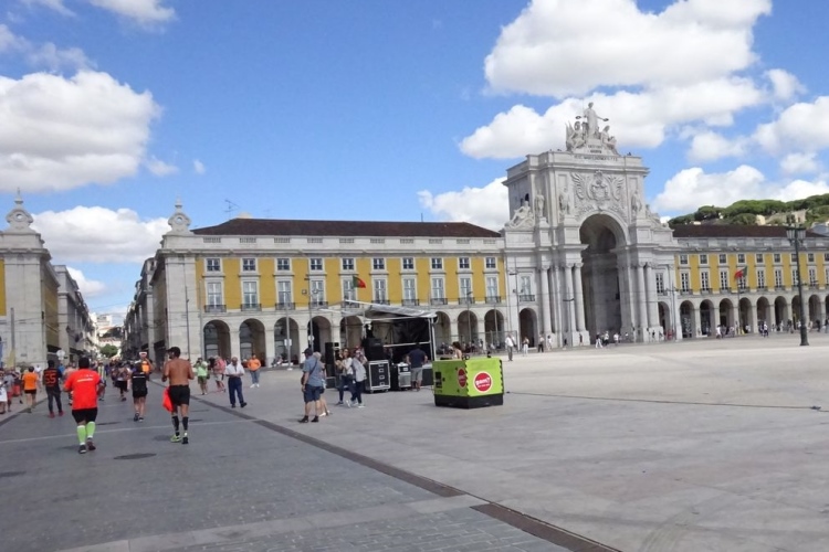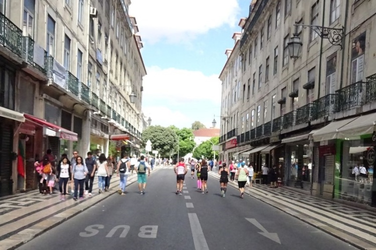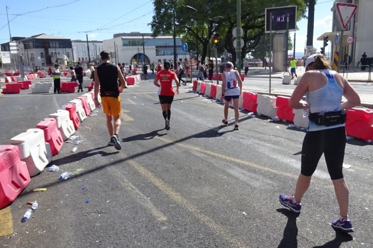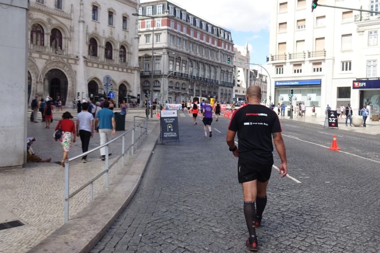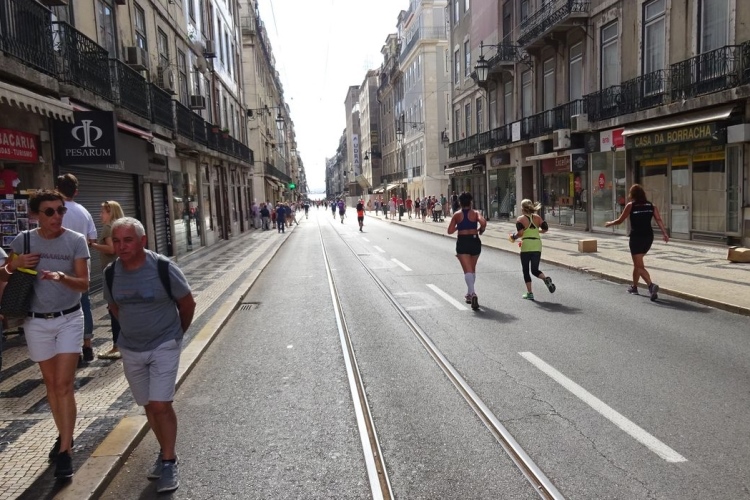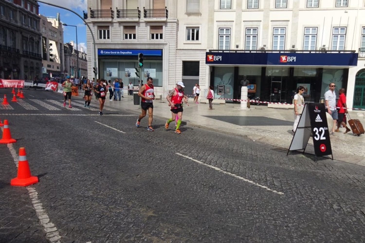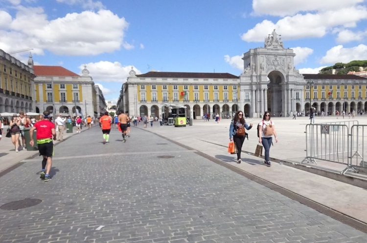 Als ein Höhepunkt des Marathons wird der Abstecher in die Altstadt von Lissabon beschrieben. Kilometer 31 befindet sich am Beginn des Praça do Comércio. Von hier geht es nun leicht ansteigend nach Norden, vorbei am Elevador de Santa Justa, dem Praca Dom Pedro IV weiter zur Metrostation Restauradores. Der Kurs dreht nun um 180 Grad, 32 km sind geschafft. Wir laufen wieder in Richtung Handelsplatz am Tejo. Obwohl es schon nach 12 Uhr mittags ist und die Glocken läuten, sind wenige Passanten unterwegs. Auch echte Zuschauer, die auf Angehörige warten, sieht man kaum.