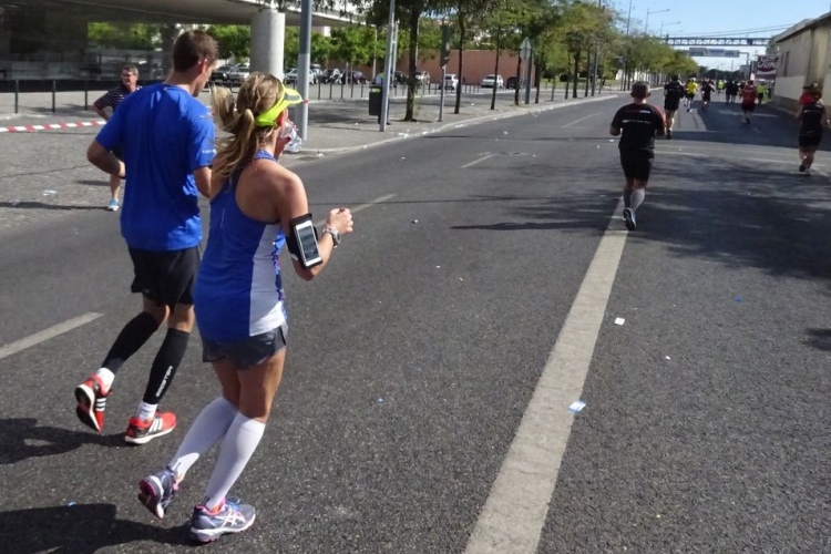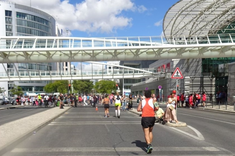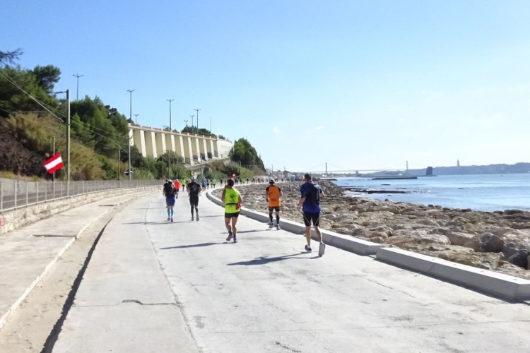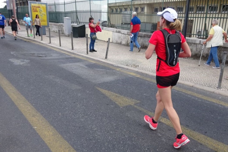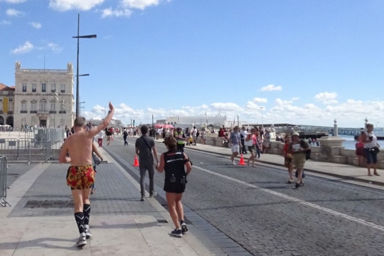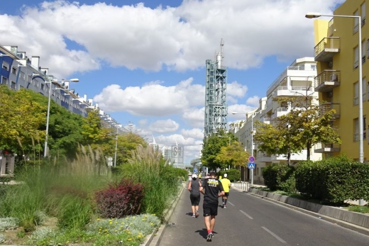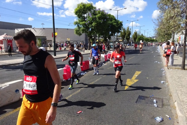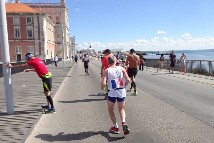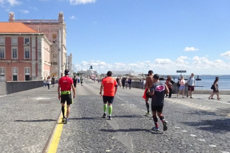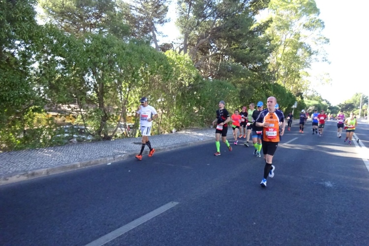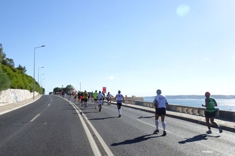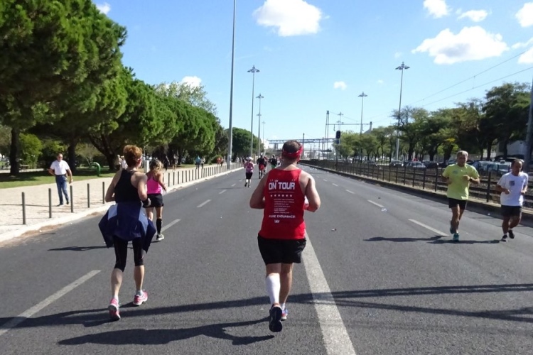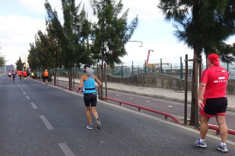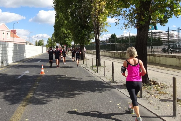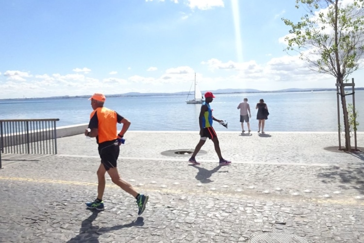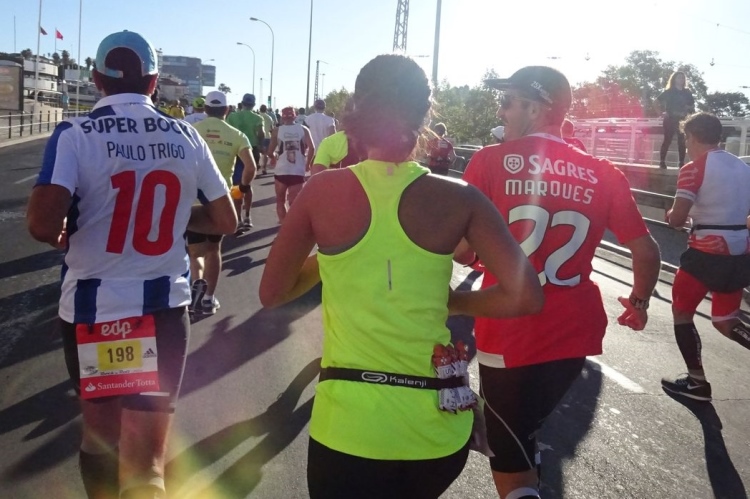 Ich spreche einen Kollegen an, der mit einer rumänischen Fahne läuft. Den Marathon in Arad kennt er nicht, er würde gerne kommende Woche in Bukarest dabei sein, aber er denkt, dass er es körperlich nicht schaffen wird. Ich ziehe an ihm vorbei, die Steigungen empfinde ich noch nicht als Erschwernis. Eine Gruppe Spanier ist gemeinsam nach Lissabon gekommen, um hier den Marathon zu laufen – wie der Aufdruck „junto vamos por Lisboa a correr!“ auf der Rückseite des Shirts verrät.