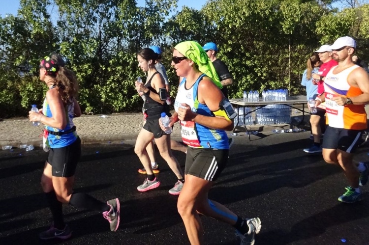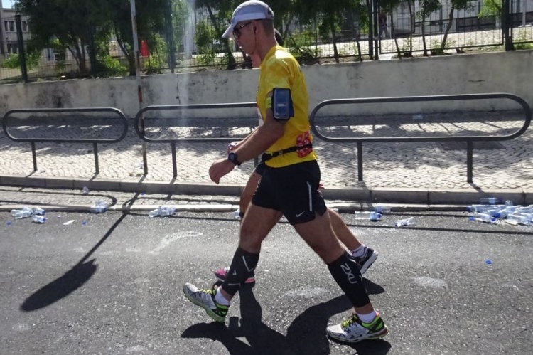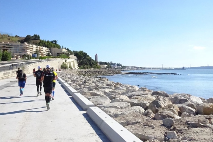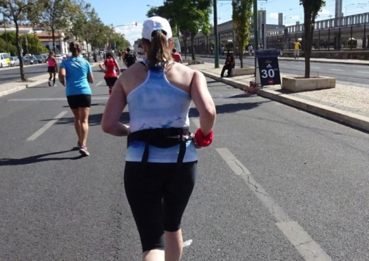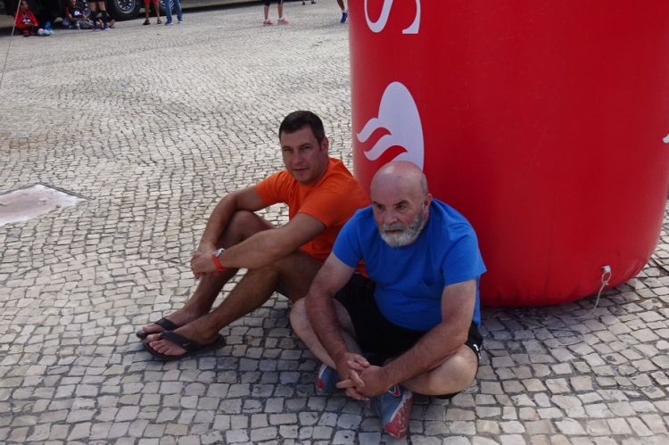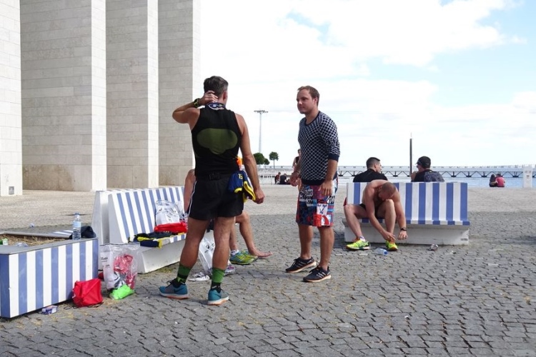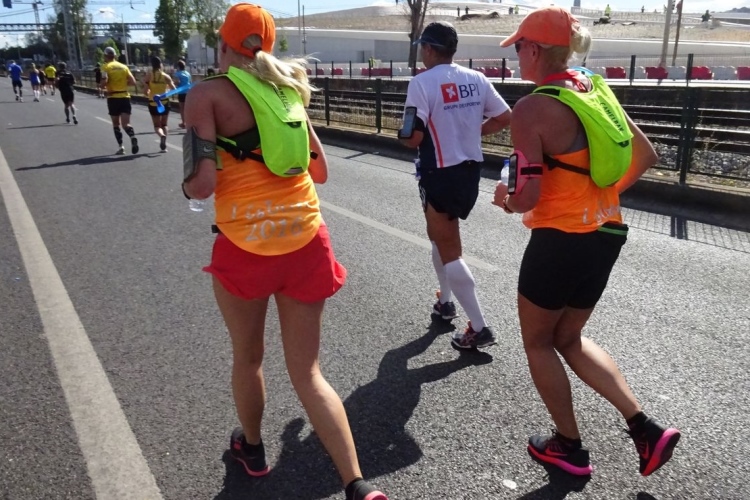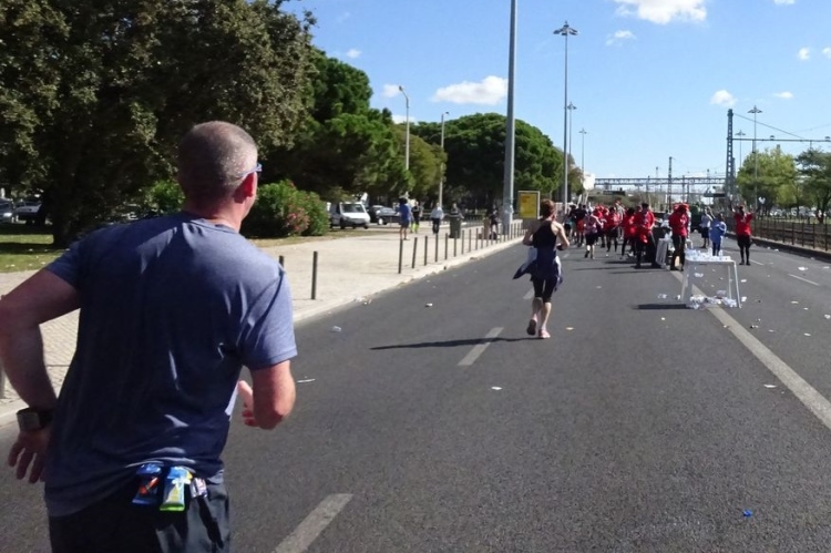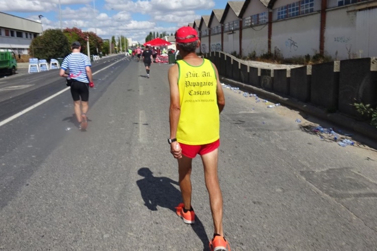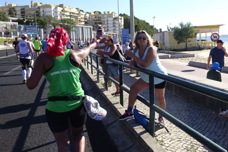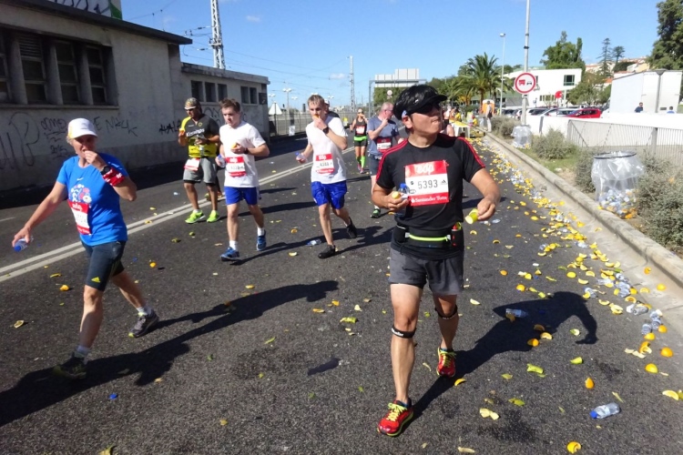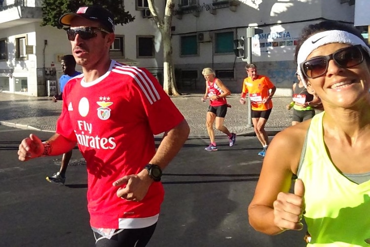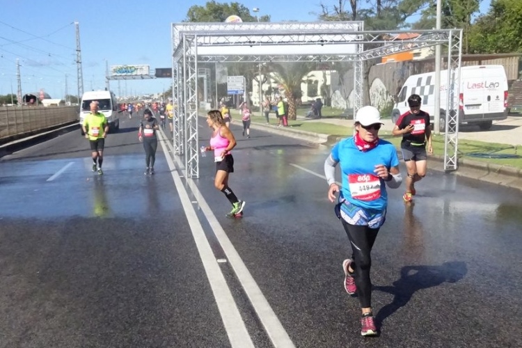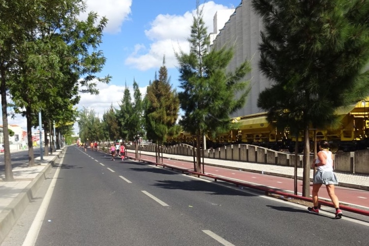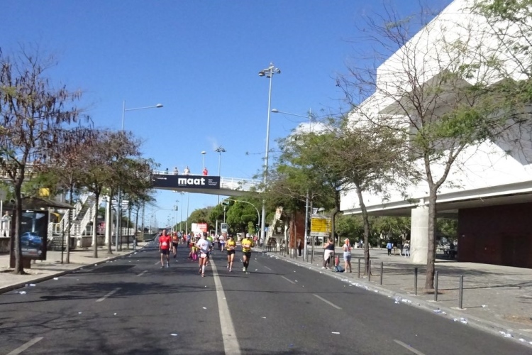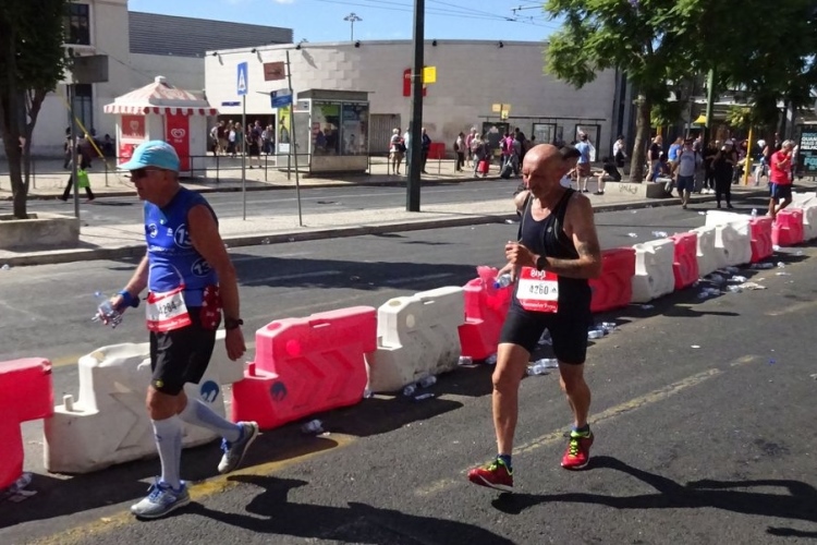 Ich spreche einen Kollegen an, der mit einer rumänischen Fahne läuft. Den Marathon in Arad kennt er nicht, er würde gerne kommende Woche in Bukarest dabei sein, aber er denkt, dass er es körperlich nicht schaffen wird. Ich ziehe an ihm vorbei, die Steigungen empfinde ich noch nicht als Erschwernis. Eine Gruppe Spanier ist gemeinsam nach Lissabon gekommen, um hier den Marathon zu laufen – wie der Aufdruck „junto vamos por Lisboa a correr!“ auf der Rückseite des Shirts verrät.