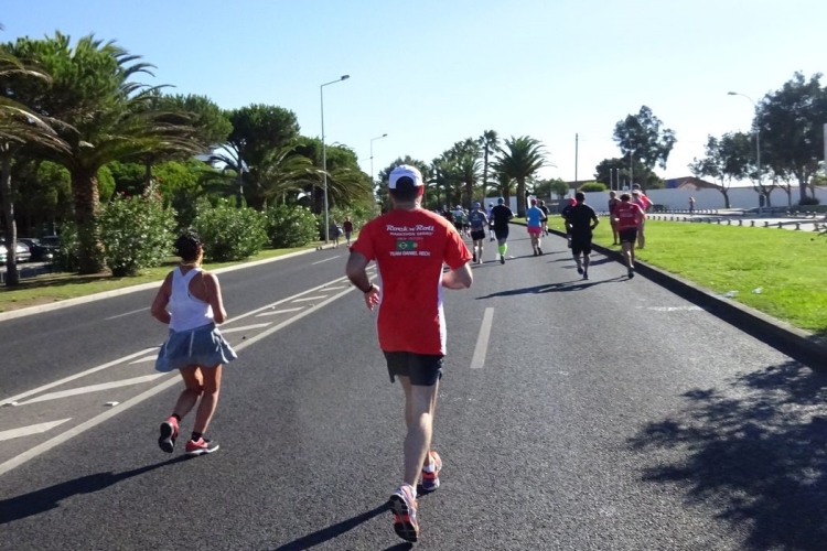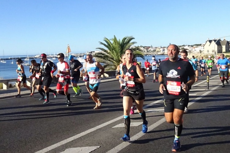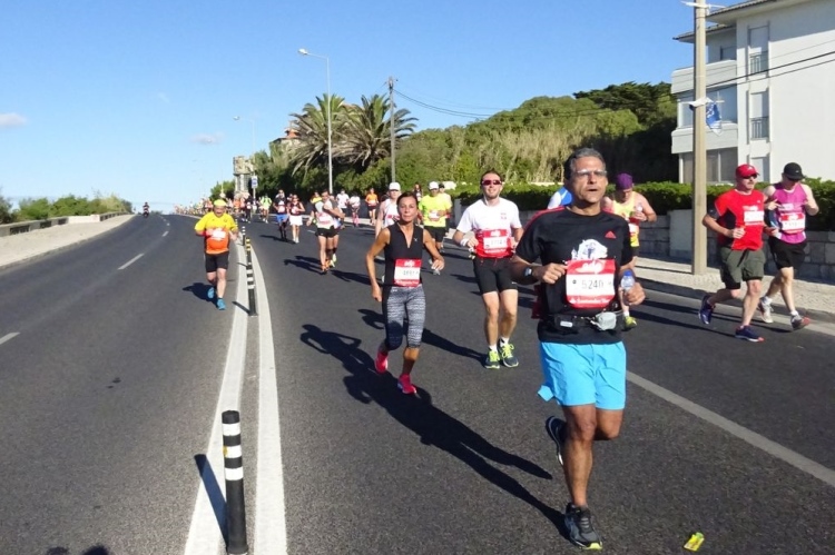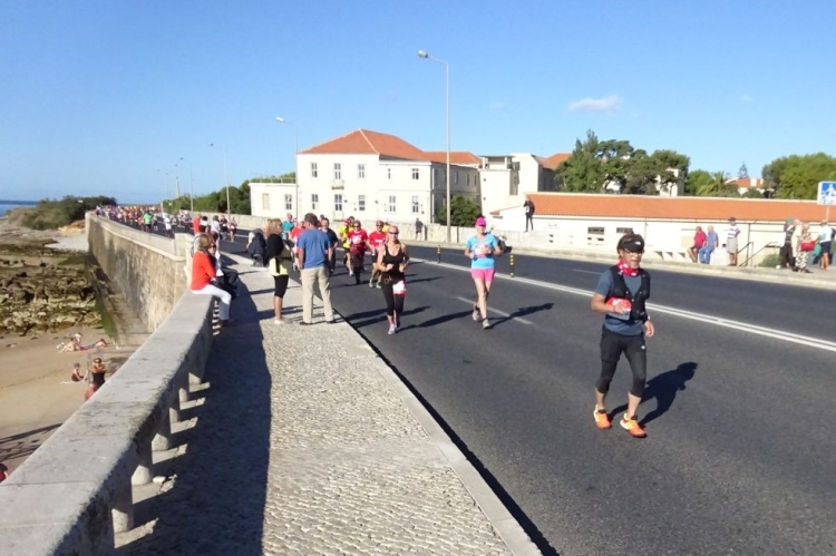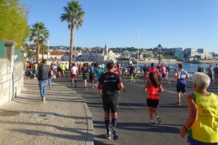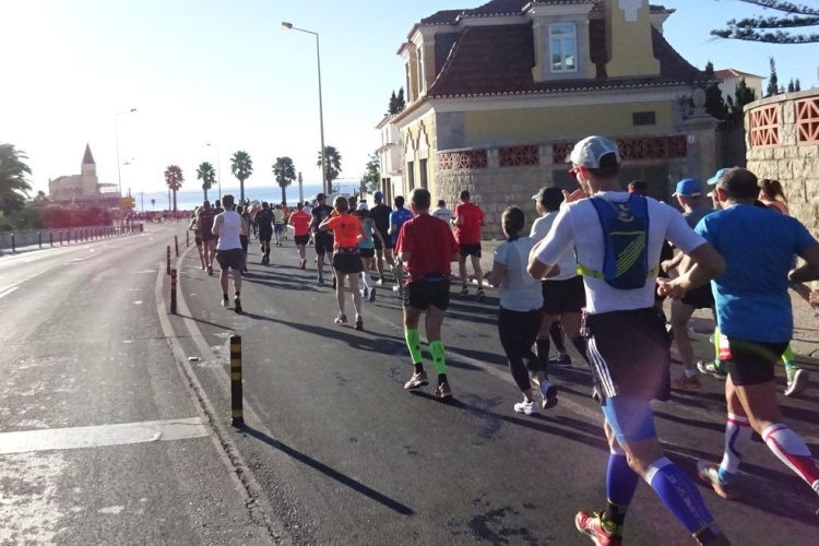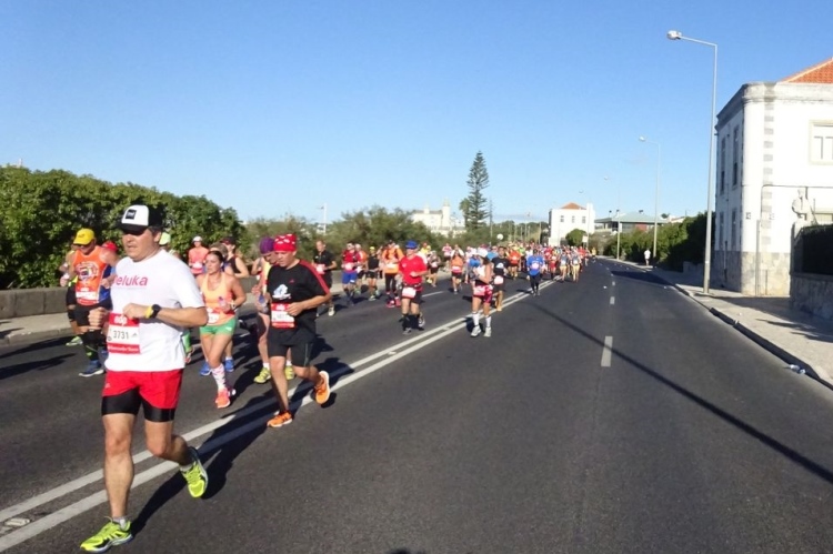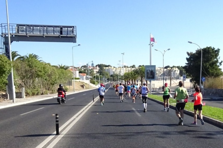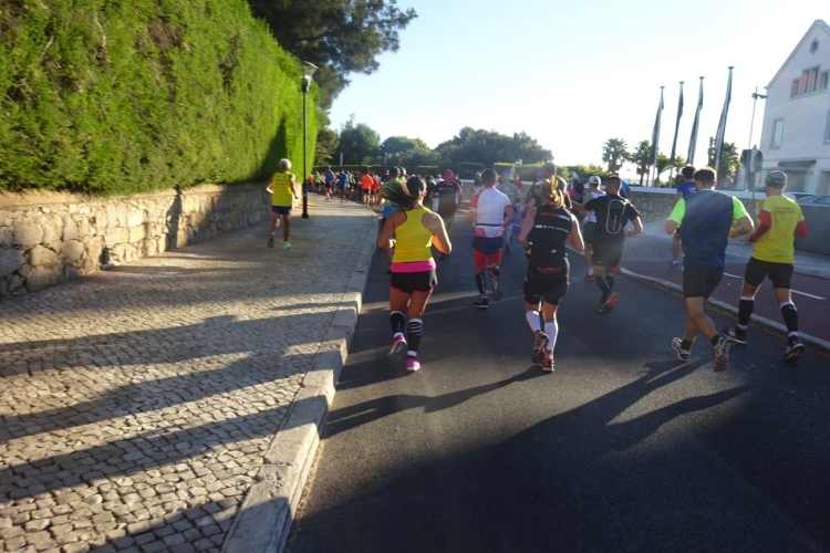 Ich stehe in der Zielgruppe 4:30 neben zwei Zugläufern, als es losgeht. Mit 2 ½ Minuten Verzögerung passiere ich die Matte – die Zeit wird über einen hinten auf der Startnummer angebrachten Chip gemessen, wie dies heutzutage fast die Regel ist. Schon beim Fußweg vom Bahnhof zum Start fiel mir auf, dass auch hier in Cascais Steigungen die Regel und nicht die Ausnahme sind. Die Av. Republica steigt um ca. 20 Höhenmeter auf dem ersten Kilometer an, dann geht es in einer langen Schleife zurück leicht absteigend in Strandnähe. Vorbei am Fünfstern-Hotel Cascais Miracem bekommt man einen guten Eindruck vom Ambiente mit der schönen Bucht und den Bauwerken wie der Fortaleza da Nossa Senhora da Luz entlang der Rennstrecke in der Stadt. Im Nu sind 3 Kilometer gelaufen, jetzt steigt der Kurs wieder an – es geht hinauf zur für den Verkehr gesperrten N6.