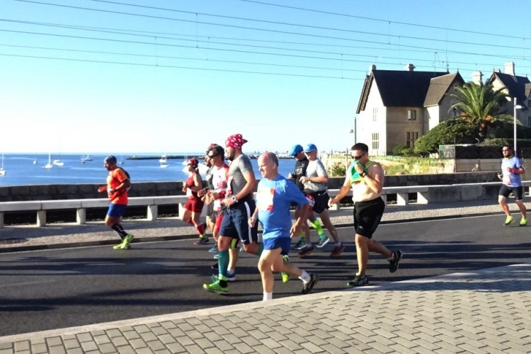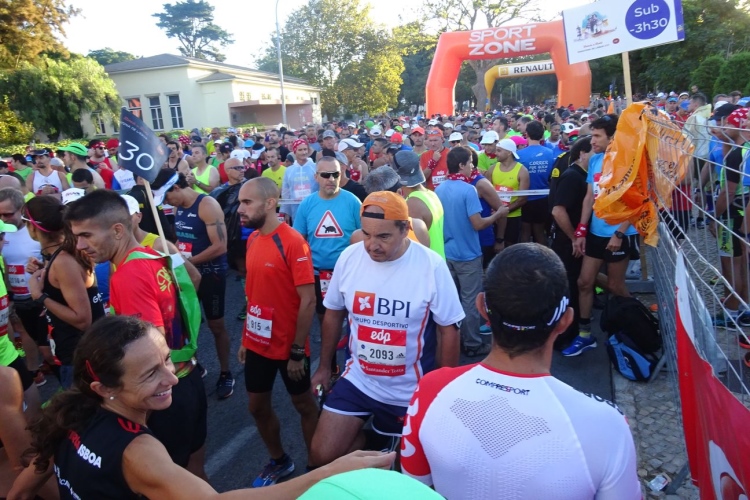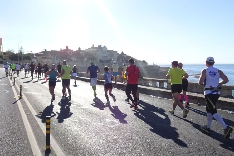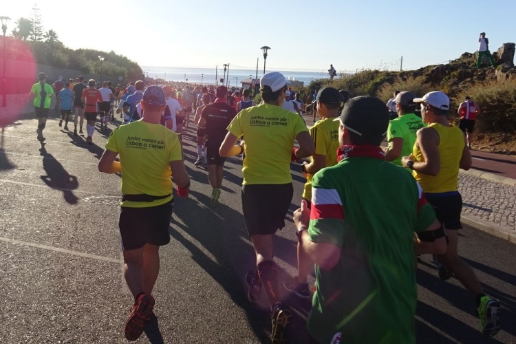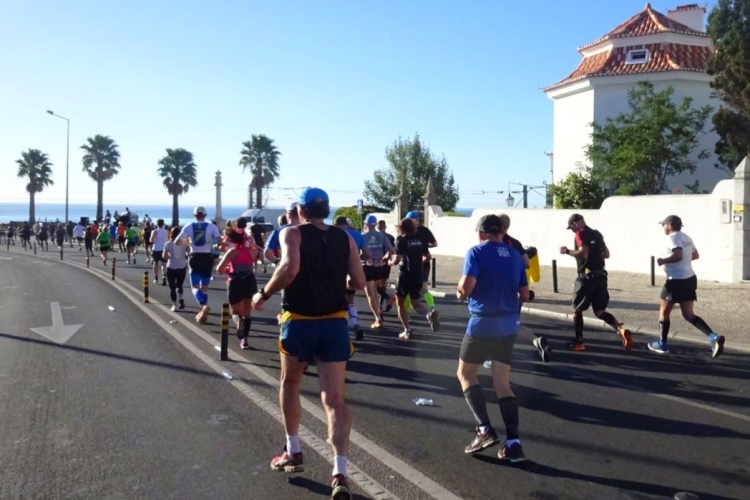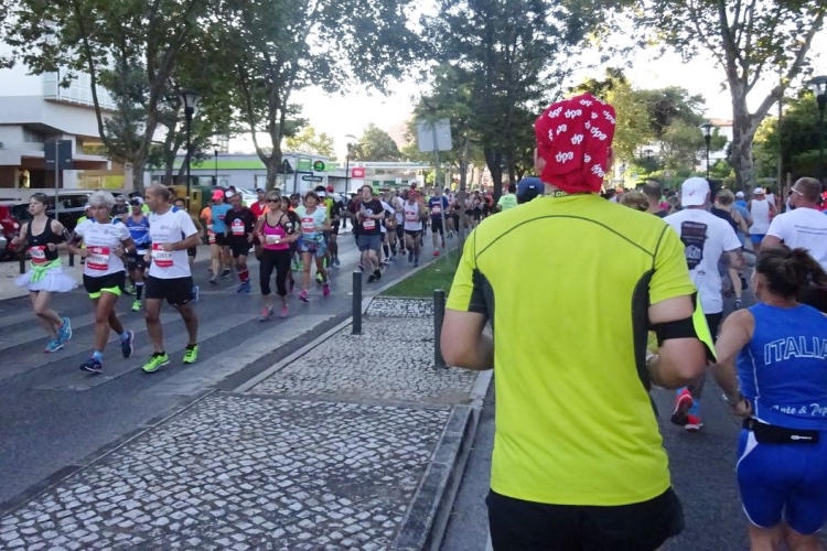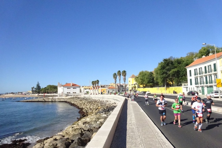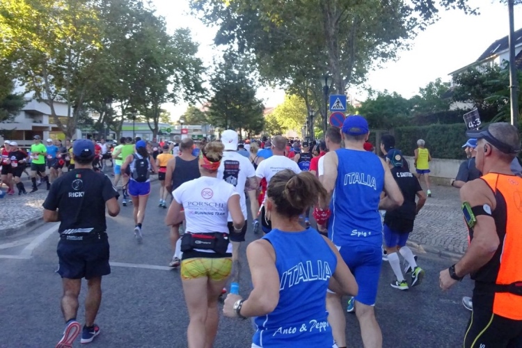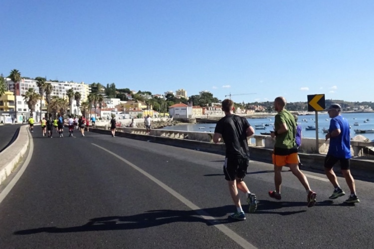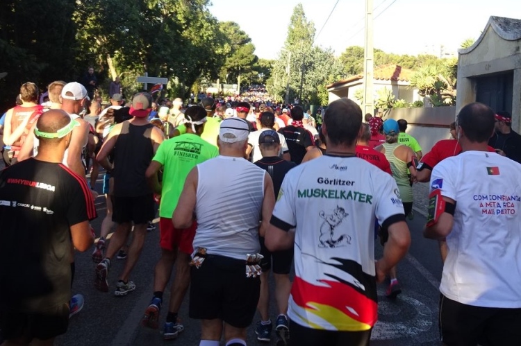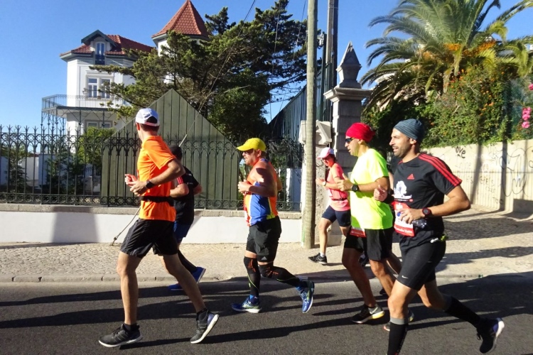 Vom Zugbahnhof in Cascais, einer kleinen Stadt, ca. gut 20 km von Lissabon an einer sandigen Bucht am Atlantik gelegen. eilen wir zum Start. Es ist bereits 8 Uhr 10, die meisten müssen noch ihren Kleidersack deponieren. Für einen Kaffee in einem der wegen des Marathons frühzeitig geöffneten Lokale bleibt keine Zeit mehr. Heute laufe ich wieder einmal im schicken M4Y-Dress, in der Stadt des Lichts (wegen der vielen reflektieren Fliesen) ist Transparenz ein Gebot und „Amtskleidung“ nicht anmaßend.
