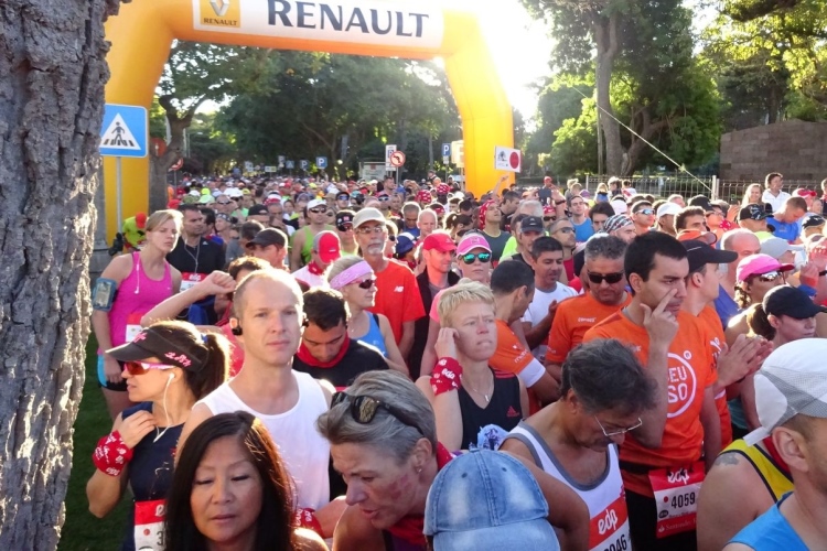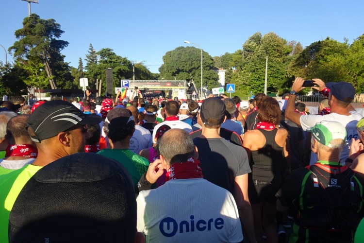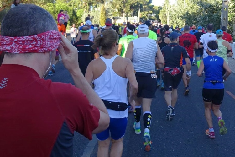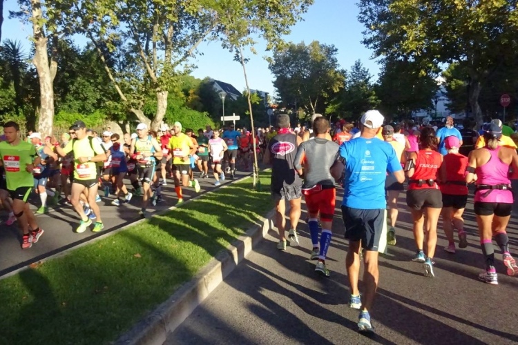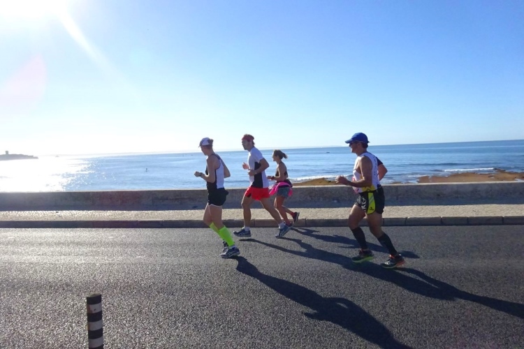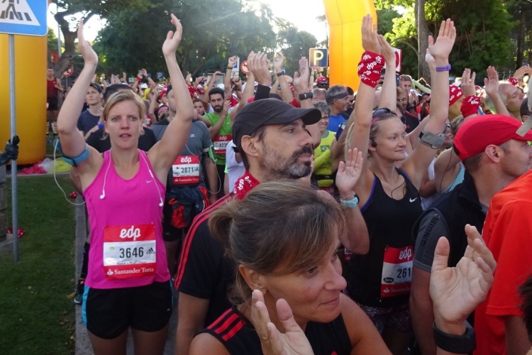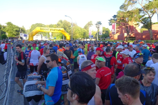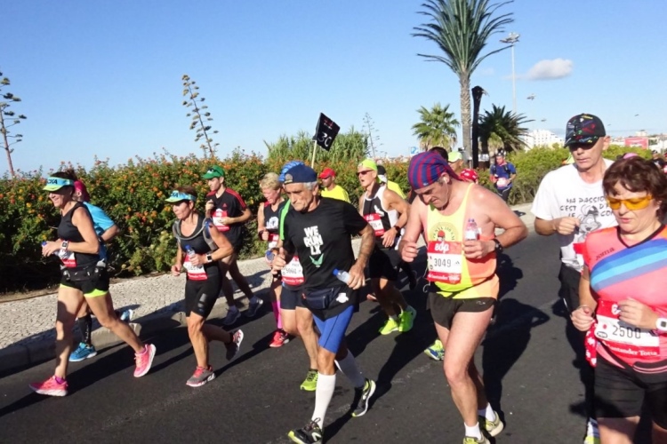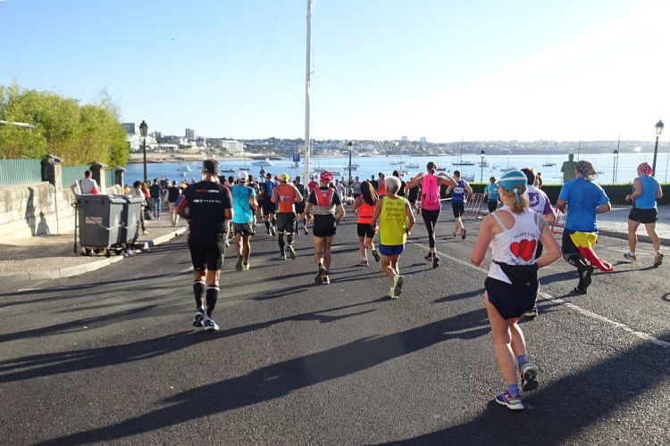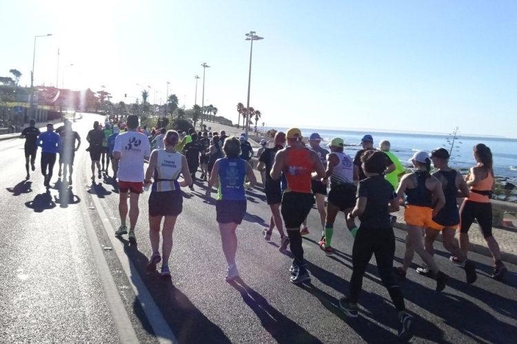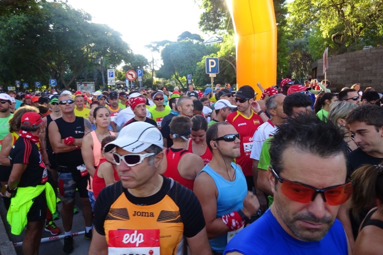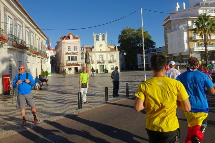 Vom Zugbahnhof in Cascais, einer kleinen Stadt, ca. gut 20 km von Lissabon an einer sandigen Bucht am Atlantik gelegen. eilen wir zum Start. Es ist bereits 8 Uhr 10, die meisten müssen noch ihren Kleidersack deponieren. Für einen Kaffee in einem der wegen des Marathons frühzeitig geöffneten Lokale bleibt keine Zeit mehr. Heute laufe ich wieder einmal im schicken M4Y-Dress, in der Stadt des Lichts (wegen der vielen reflektieren Fliesen) ist Transparenz ein Gebot und „Amtskleidung“ nicht anmaßend.
