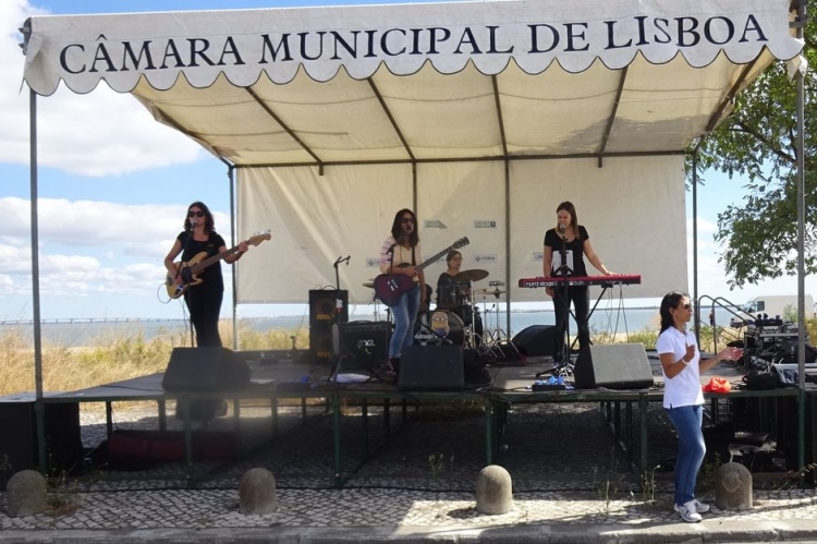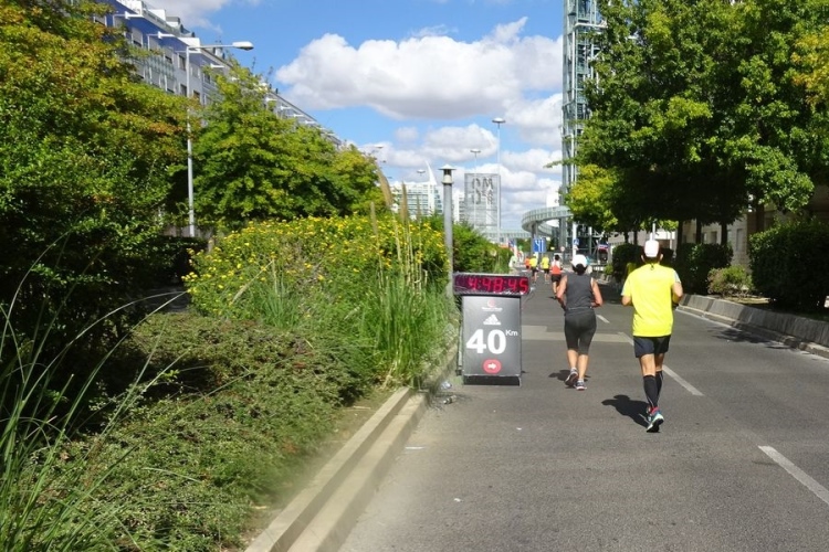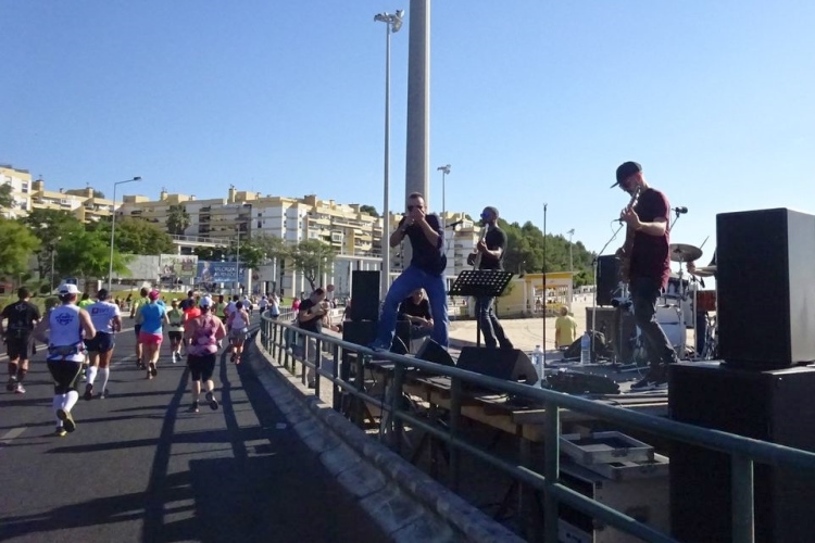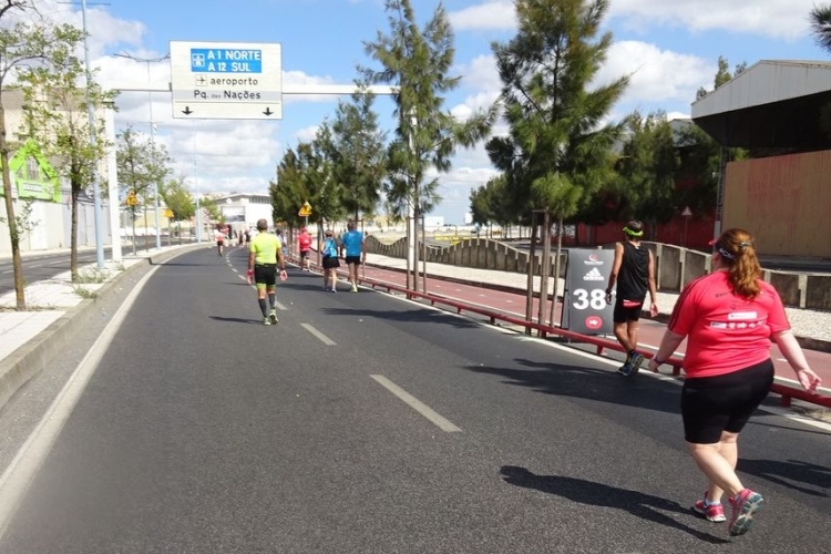 Mein Ziel, die 35 km noch unter 4 Stunden zu erreichen, geht nicht auf – schon bei der 34 km-Tafel zeigt mein Display 4:01 an. 8 Kilometer gleichmäßig in einer 7er-Zeit zu laufen, wird schwer zu schaffen sein. So ab Kilometer 34 befinden sich unter uns auch die allerletzten Nachzügler des Halbmarathons, der von der Vasca da Gama-Brücke gestartet wurde und in Richtung Zentrum nach Westen führt. Das Ziel liegt auch in der Nähe des Parks der Nationen. Als Ansporn für die müden Läufer spielt bei Kilometer 39 die Camara Municipal de Losboa, eine Frauenband, für uns auf.