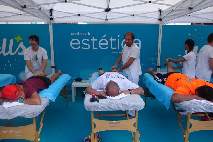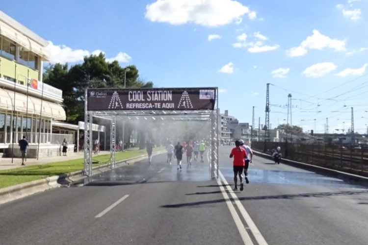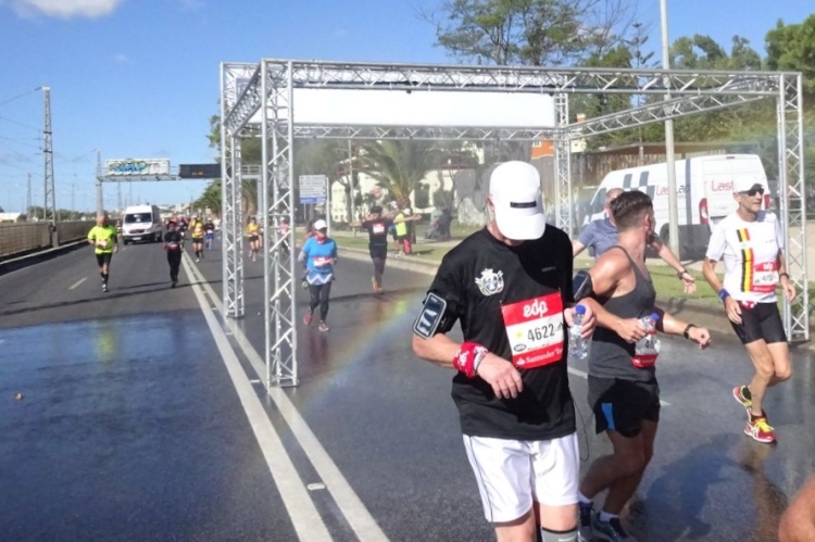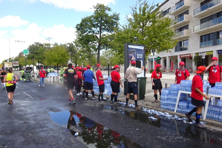 Jetzt sieht man schon die Kraftanstrengung einigen Kollegen an, die der Marathon ihnen auf den Steigungen abverlangt hat. Die Cool-Station nahe Belem kommt ihnen gerade recht – ich verzichte auf den Durchlauf unter dem Sprühregen, weil ich mir die Schuhe nicht nass machen will – nur allzu leicht entstehen mit nassen Socken Reibblasen.