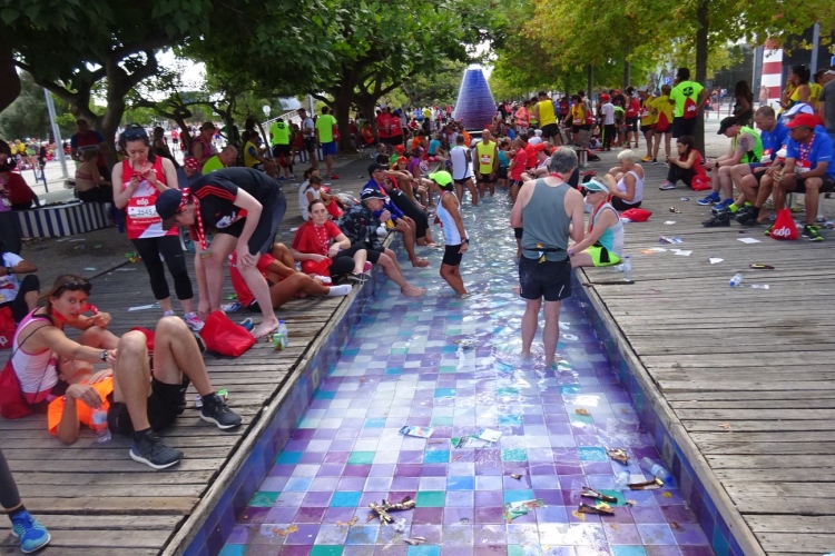 Wie bei den ganz großen Marathons stehen mehrere Fotografen für ein professionelles Zielfoto vor einem passenden Hintergrund-Sujet bereit. Wer sich in die Schlange stellt, hat die Möglichkeit, sich professionell massieren zu lassen. Beim Verlassen des Zielbereiches wird ein Stäbchen-Eis mit einem Schokoüberzug verteilt, zudem kann man sein Goodie-Package entgegennehmen. Jetzt um 13 Uhr 30 nachmittags ist es in der Sonne schon zu heiß geworden, daher setze ich mich auf eine schattige Bank im nahen Park und konsumiere alles auf, was sich im roten Sack befindet.