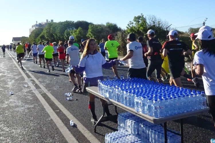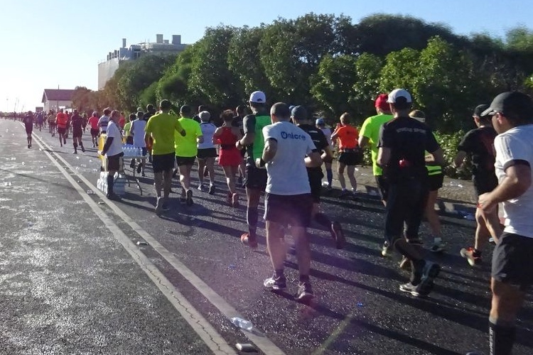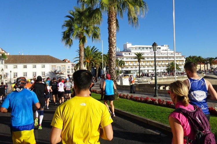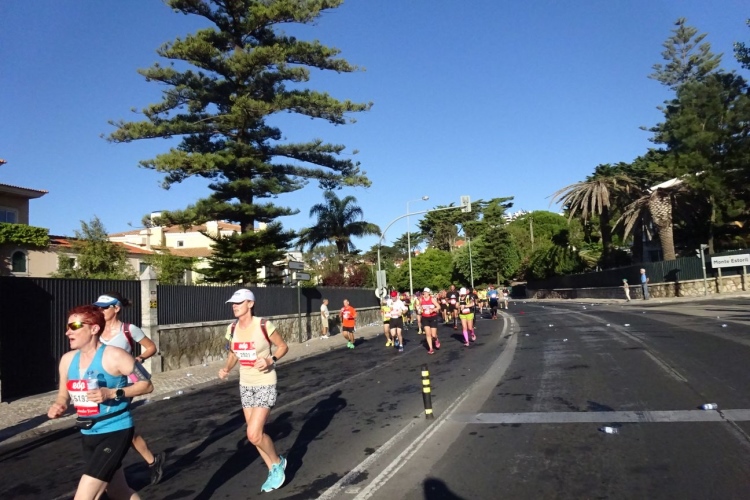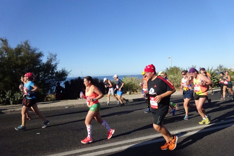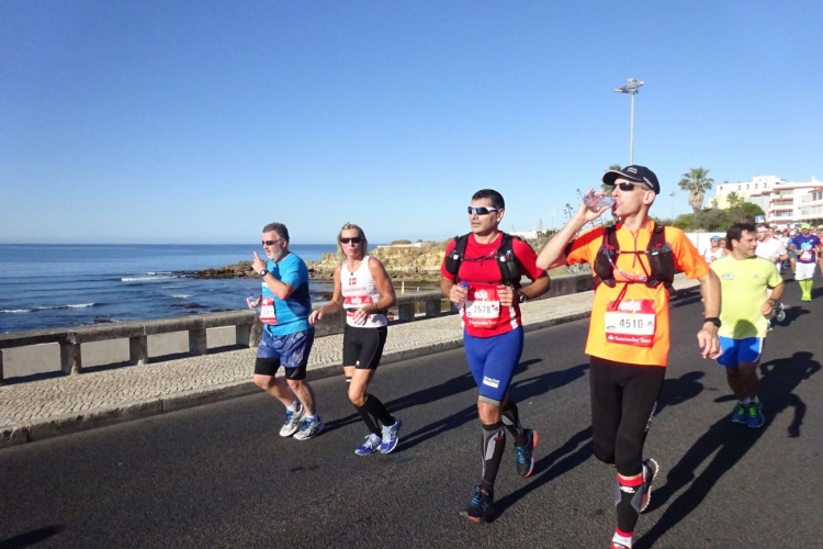 Bei der ersten Versorgung gibt es Wasser in kleinen Plastikflaschen. Einige Kollegen kämpfen auf dem Anstieg in die Ortschaft Monte do Estoril jetzt schon nach 5 km, leicht wird der Marathon gewiss nicht, aber die Kulisse ist grandios. Das Gegenlicht für den Fotografen hingegen schwierig zu meistern.
