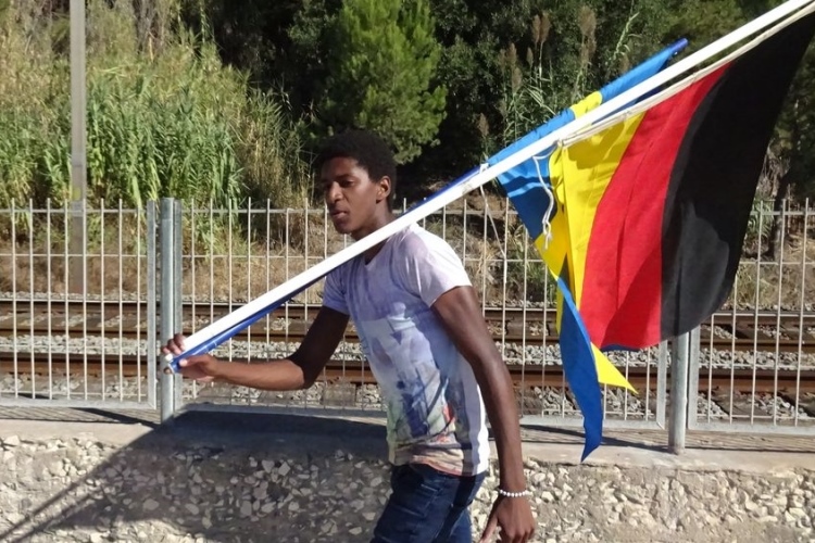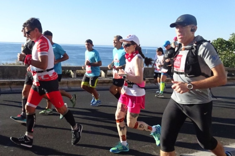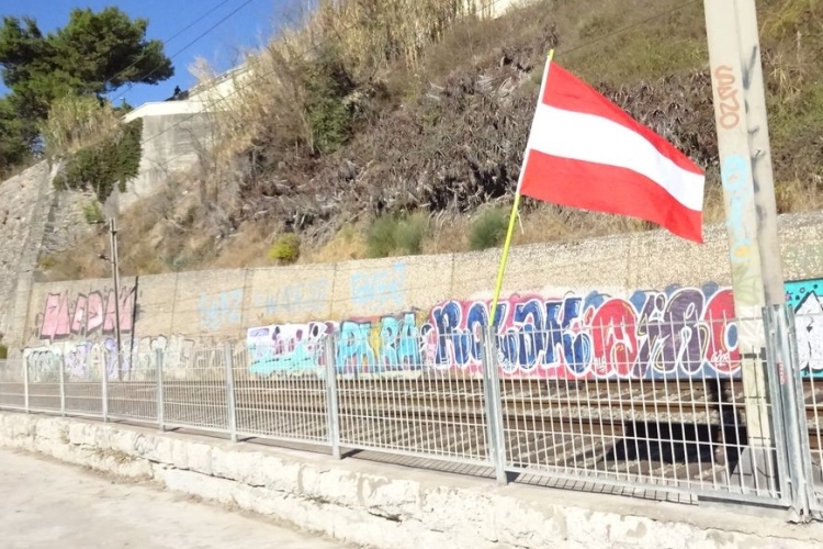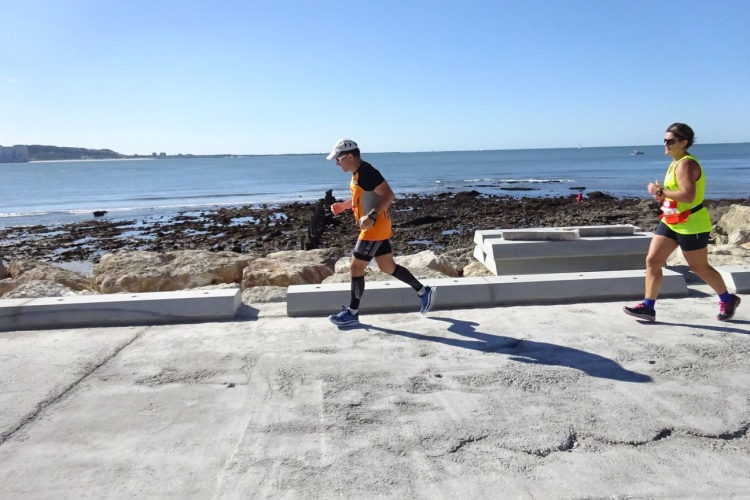 Bald führt der Kurs von der N6 weg auf eine Schotterstraße entlang der Küste. Hier wurde der Strand verbreitert bzw. mit großen Steinen eine Böschung gegen die Wellen geschaffen. Zur Untermalung der sonst schönen Strecke hat man linkerhand des die Straße von der Bahnlinie trennenden Zaunes die Fahnen der teilnehmenden Nationen über eine Distanz von gut einem Kilometer angebracht. Natürlich ist auch die österreichische dabei – schon wegen der hübschen Mädels vom Golser Ultralaufteam, die am Start alle einen sehr fitten Eindruck machten. Die gesamte Gruppe dürfte inzwischen weit vor mir liegen.