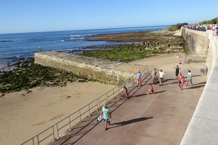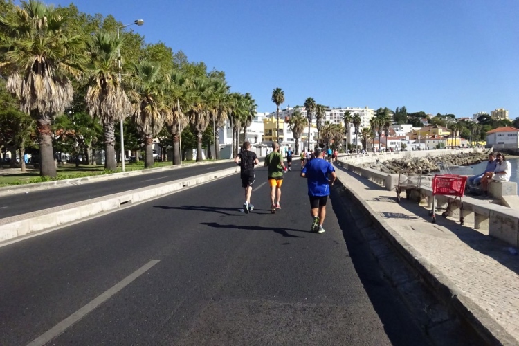 Die sonst stark befahrene Küstenstraße ist mittels Pylonen halbseitig gesperrt, wegen der Abschüssigkeit nach rechts laufe ich den engen Kurvenradius und muss hie und da einem Einsatzfahrzeug ausweichen – meistens sind es Fotografen auf Motorrädern oder der Notarzt auf einer lauten Quadmaschine. Die Strände hier in Estoril wirken sehr gepflegt, das kann man auch beim Vorbeilaufen erkennen. Doch zum Baden ist der Atlantik wenig einladend, eher zum Surfen. An diesem Sonntag bei strahlendem Sonnenschein sind jetzt gegen 9 Uhr 30 bereits zahlreiche Strandbesucher anzutreffen, die uns zuwinken. Wir kommen zur 10 km-Marke, 64 Minuten zeigt meine Uhr. In Anbetracht der Steigungen eine an die Verhältnisse angepasste Laufzeit.