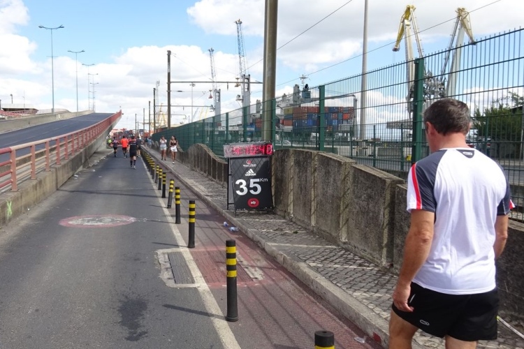 Nahe dem Knotenbahnhof Cais do Sodre, wo wir heute Morgen in den Zug nach Cascais eingestiegen sind, befindet sich die 30 km Anzeige. Ich bin leider auch langsamer geworden. 3:29 zeigt die Uhr an. Mit 3:20 für 30 km ist eine Zeit unter 5 Stunden für mich zu schaffen, sonst wird’s knapp.