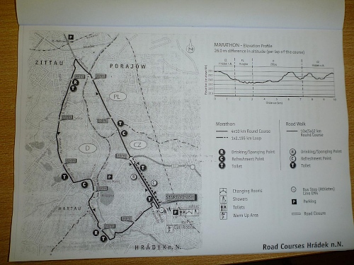 Start und Ziel ist am Ortsausgang an der Zitavské (Zittauer Straße) mit Laufrichtung Polen. Wenige Minuten vor dem Start erhalten wir die letzten Informationen in Englisch und Deutsch, die eher als Mahnung oder Warnung gelten sollen. Denn wer geht und erwischt wird, bekommt eine erste gelbe und zweite gelbe Karte. Und wer zum dritten Mal dem Kontrolleur auffällt, der wird disqualifiziert. Dazu heißt es kurz und knapp: „This is not a walking event, this is a race!“ Davon steht allerdings nichts im Handbuch. Dass es beim Gehen bei „unsauberer“ Ausübung des Schrittes die rote Kelle gibt, ist bekannt, aber beim Marathon? Komisch, denn beim Marsch braucht man mehr Zeit. Ich sehe da keine Logik. Ein paar Meter Gehen bei den Versorgungsstellen ist aber erlaubt.