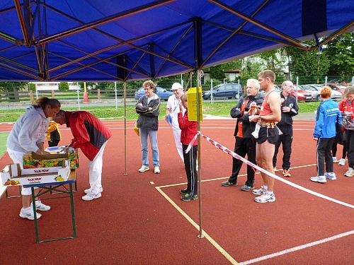 Die ersten fast vier Kilometer verlaufen mit leichtem Gefälle Richtung Zittau. Am Grenzübergang von Tschechien zu Polen ist die erste von zwei Versorgungsstationen eingerichtet. Getränke, Erfrischungen, Obst (Äpfel, Bananen) und nasse Schwämme sind bereitgestellt. Und hier gibt es eine weitere Hürde. Das Verpflegen ist nur innerhalb der markierten Versorgungspunkte erlaubt. Wer außerhalb dieser Stationen sich etwas zureichen lässt, kann disqualifiziert werden. Es gibt hier weitere Tische für die eigene Verpflegung. Das Zureichen ist allerdings nur Offiziellen erlaubt.