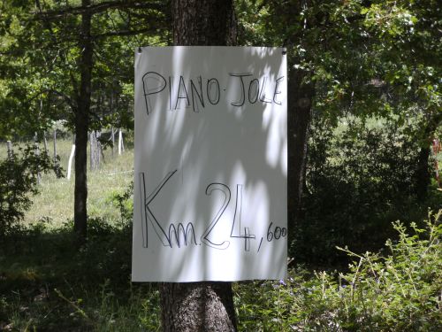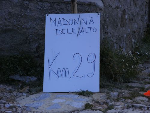 Die letzten Kilometer vergehen wie im Flug. Ich freue mich auf das verabredete Eis in der Gelateria in Polizzi und laufe den Berg hinab. Gottlob hat es zum Teil Schatten. Die Sonne strahlt mächtig und setzt jedem Läufer arg zu. Kurz vor Polizzi geht es über die SP 119 ein letztes kurzes Stück steil hinunter, dann stoßen wir bei der Chiesa Madonna della Pieta auf den Hinweg. Ein Schild zeigt an, dass es nur noch 1,3 km bis zum Ziel sind.