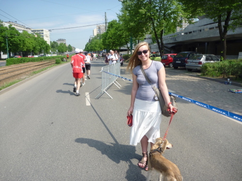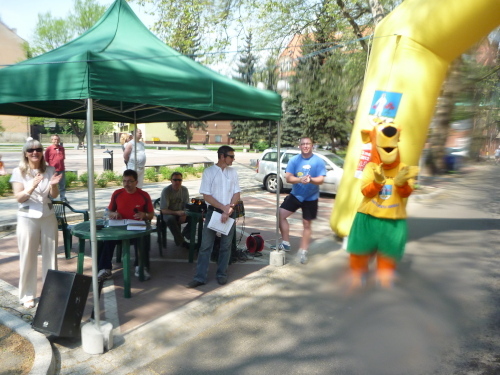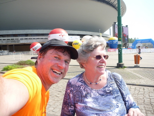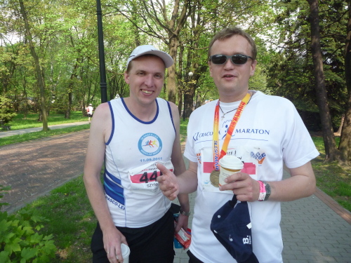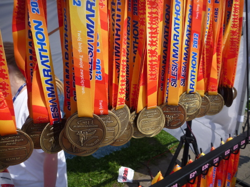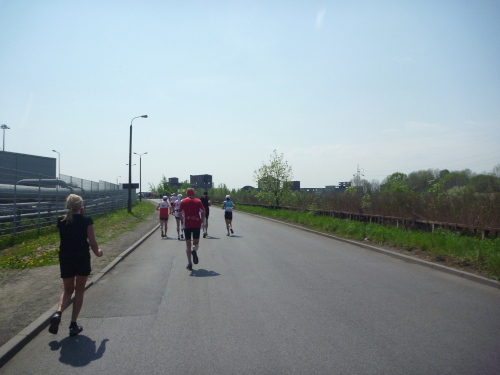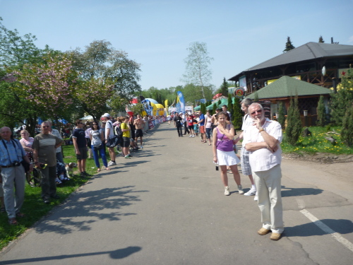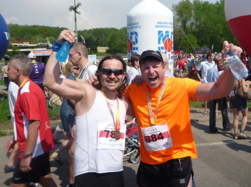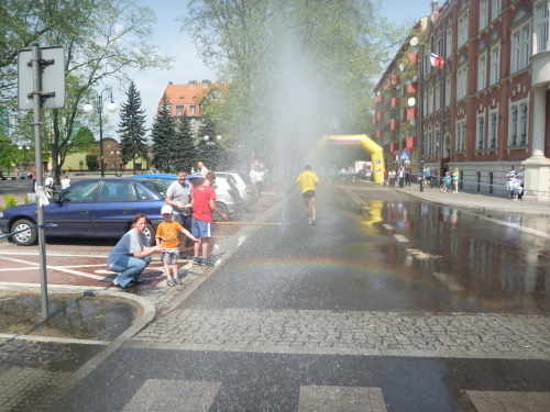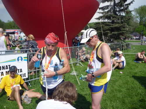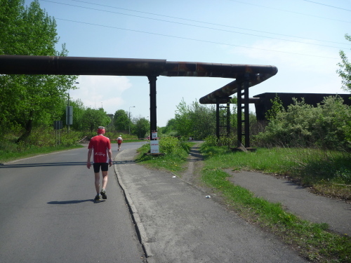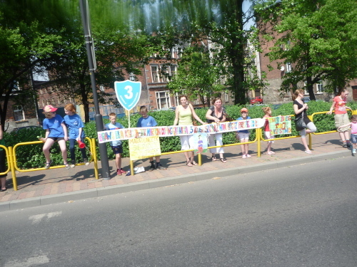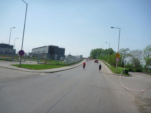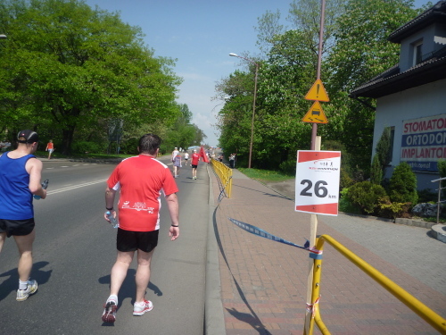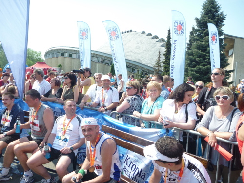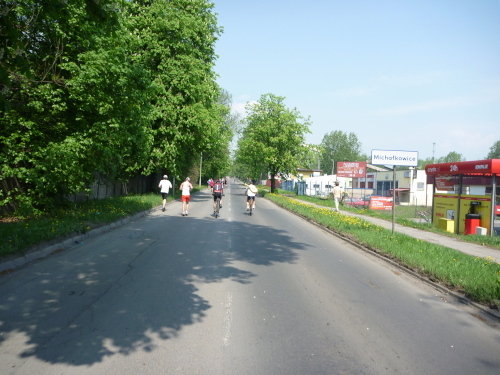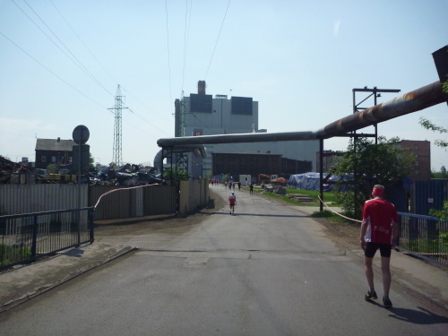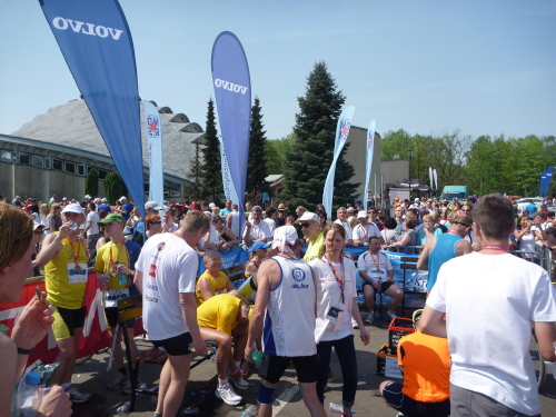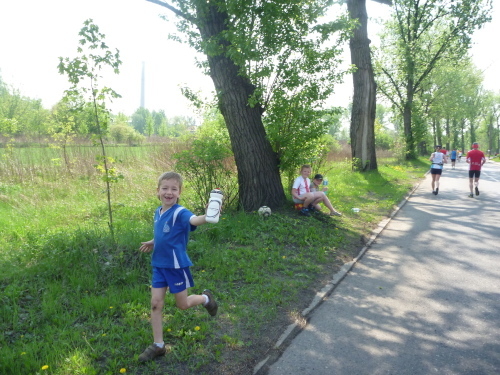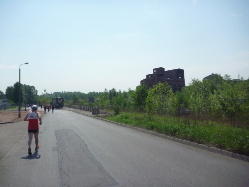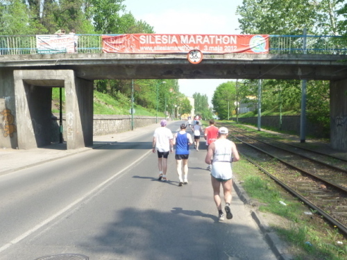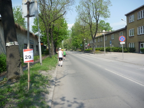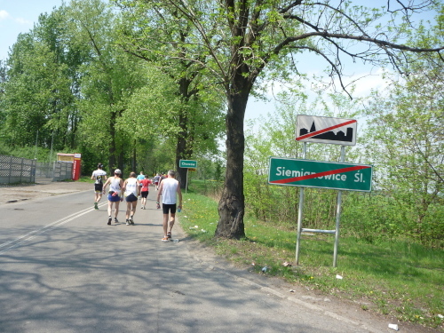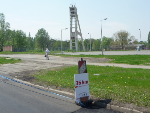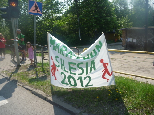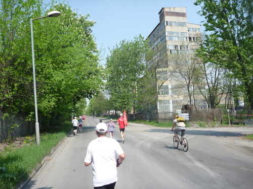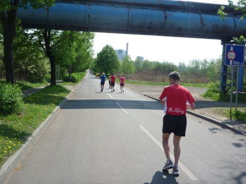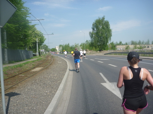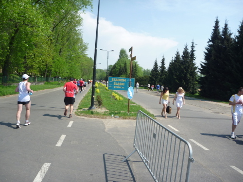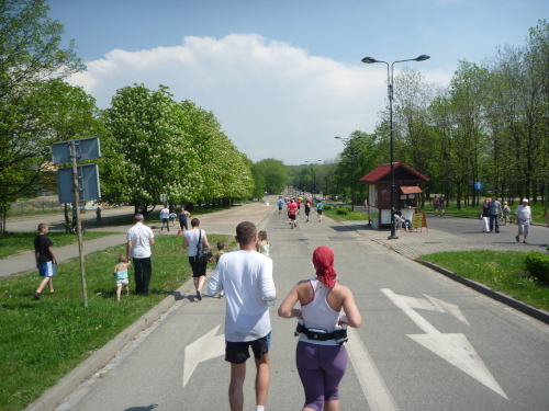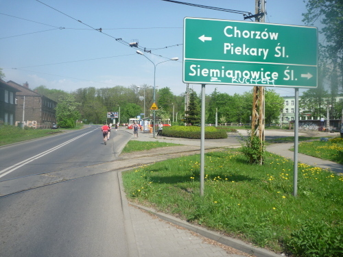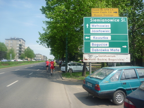 Wir biegen nun ab nach Norden über die Aleja Korfantego (Korfanty Allee), wo ich ein günstiges Hotel gefunden hatte und laufen zurück zum Spodek, um die 400 Halbmarathonläufer mitzunehmen. Meine Mutter war mit meinem Großvater zum Fußball, Boxen und Catchen, alles in Kattowitz, nun ist sie sogar zum Marathon und steht vor dem Spodek, um mir eine Flasche Wasser zu reichen.
