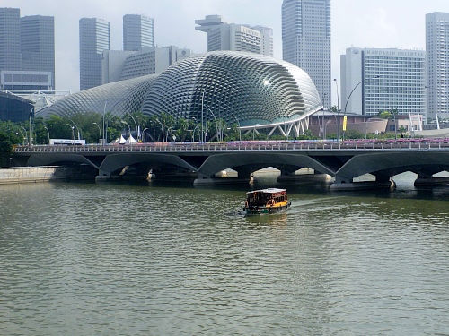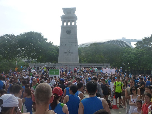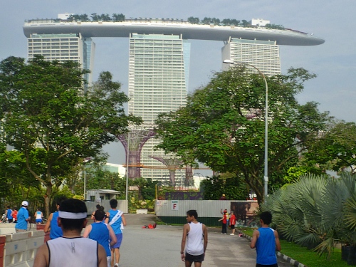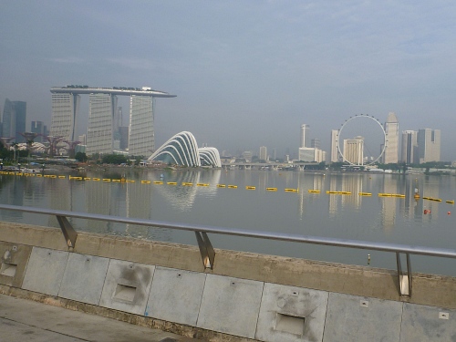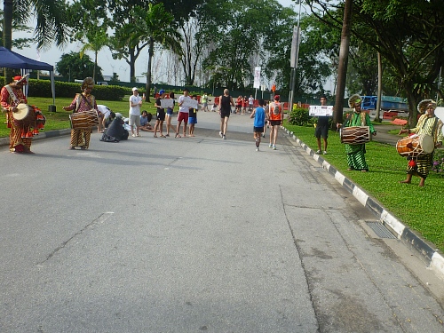 Im Business-Distrikt gibt es auch schon Zuschauer (5:30 Uhr – vielleicht Investmentbanker, die gerade wieder eine Bank auf der anderen Seite der Welt in Schwierigkeiten gebracht haben) und Trommelgruppen. Es geht am altehrwürdigen Fullerton Hotel vorbei. Hier steht auch das Wahrzeichen Singapurs: der Merlion, ein Löwe mit Fischkörper, den man leider in der Dunkelheit nicht sieht, dafür aber die neue Konzerthalle, die aussieht wie die in Asien so beliebte Durian-Frucht (deutsch: Stinkfrucht).