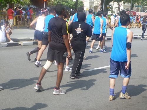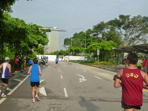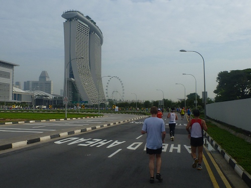 Wir kommen nun an der Marina-Bay zu einer Tribüne, die wohl für die Formel-1- Veranstaltung gebaut wurde. Es ist jetzt stockdunkel. Ich sehe noch eine Box mit der Überschrift „Jenson Button“. Während der nächtlichen Formel-1-Rennen soll es hier wesentlich heller sein. Weiter geht es über breite, beleuchtete Straßen vorbei an Plattenbauten bis km 13. Alle drei Kilometer gibt es Wasser und meist auch ein isotonisches Getränk. Dazu viele Streckenposten, die allesamt viel Stimmung machen. Und auch Zuschauer., teilweise übernächtigte Jugendliche.