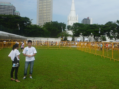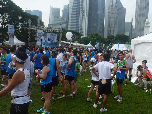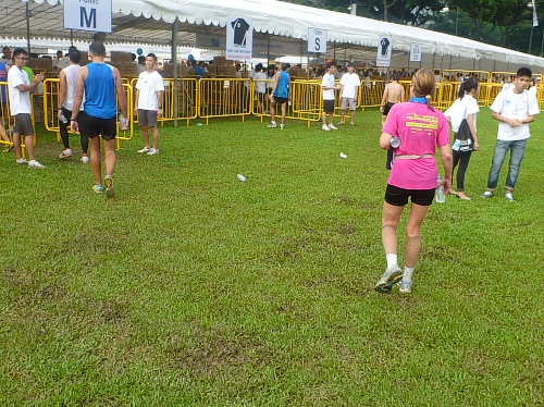 Zur Belohnung gibt es eine schwere Medaille und noch ein zweites Funktions-Finisher-T-Shirt auf dem altehrwürdigen Sportfeld des Singapur-Cricket-Clubs vor der City Hall. Der Rasen ist regendurchweicht, an ein Hinlegen ist nicht zu denken. Für die Full-Marathonläufer gibt es noch eine kostenlose Massage und hier erkenne ich endlich, was das Chinesen-Prinzip bedeutet: (das soll nicht abwertend sein, sondern nur bedeuten, dass man auch außerhalb der Softwareentwicklung durchaus nach dem Motto „Viele Hände - Schnelles Ende“ arbeiten kann). Es gibt so viele Massagestände mit jeweils zwei Masseuren, dass man nicht warten muss.
