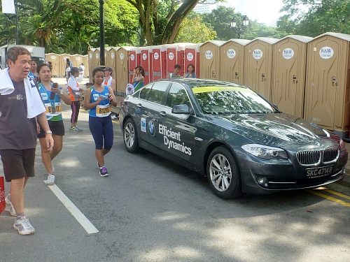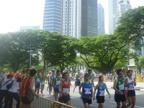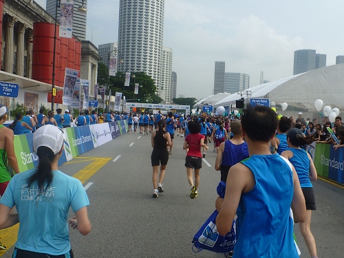 Bei den ersten dunklen Büschen nach dem Tunnel sieht man viele Läufer seitwärts verschwinden, wie man das ja von Marathons so kennt. Anscheinend schaut die Polizei nicht hin. Judith wartet bis Kilometer drei und stellt sich in die Warteschlange vor den ersten Toilettenhäuschen. Ich warte hinter der Verpflegungsstelle auf sie und lasse mich mit halb leeren Wasserbechern bewerfen. So fühlt man sich also als Helfer an der Wasserstelle. Und ich warte. Geschlagene sechs Minuten. Kann ja sein, dass es länger dauert. Inzwischen sind die 7-Stunden Pacemaker an mir vorbei gezogen und ich entschließe mich endlich weiterzulaufen. Vielleicht habe ich Judith übersehen? Jetzt fühlt sich die Läufermenge schon kompakter an. Am alten Feuerwehrhaus laufen wir über den Singapur River. Hier gibt es noch einige historische Häuschen. Eine Zeit lang wurden die einfach abgerissen und durch Wohnhochhäuser ersetzt, so ähnlich war das wohl auch bei uns in einigen Städten.