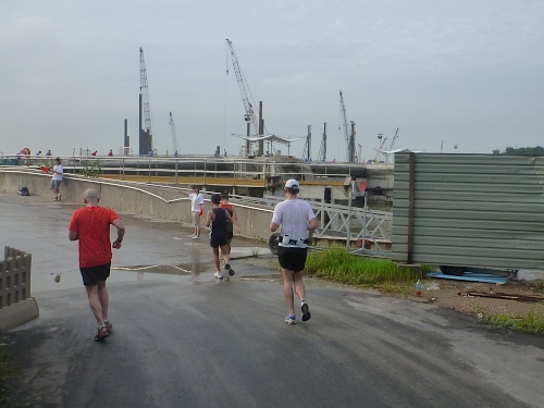 Der Sonnenaufgang ist kurz vor einer Staffelwechselstelle zu sehen, dann bewölkt es sich wieder. Der Weg von der Wechselstelle zurück zum Laufweg ist komplett von einer Pfütze bedeckt. Nett zu sehen, wie die Staffelläufer versuchen, sie zu umgehen. Nach 15 Minuten ist es schon sehr hell – So schnell geht das nur am Äquator, an dem Singapur fast genau liegt.