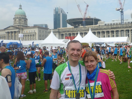 Und jetzt kommt der krönende Abschluss: Während ich in Europa mit meinen 3:5X h immer hoffen muss, in der ersten Hälfte der Wertung zu bleiben, bin ich in Singapur unter den ersten 7% der Finisher. Judith ist noch besser und die 107. Frau bzw. 4. ihrer Altersklasse (10 Jahreseinteilung). Es hat sich also wahrlich gelohnt.
