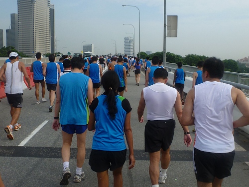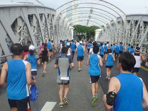 Auf einmal kommen von links viele Spaziergänger in Laufkleidung auf unsere Strecke. Das sind die 21- und 10-km-Läuferinnen und Läufer, die auf der Freizeitparkinsel Sentosa im Westen gestartet sind. Hier bei km 38 (laut meiner GPS-Uhr – es gibt mal wieder keine km-Tafel) sind sie schon weit über zwei Stunden unterwegs und es sind sehr viele. Der Veranstalter hatte doch gebeten, dass die Langsamen sich links halten sollen. Bitte, wo ist denn links? Gut, dass es jetzt auch noch auf eine hohe Brücke geht. Da sind wir heute schon mal drüber gelaufen und inzwischen ist sie gefühlt wesentlich höher geworden.