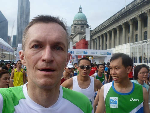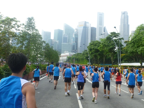 Der Laufweg wird immer enger. Das gibt es doch nicht: Eine breite Straße, bei der links und rechts Spuren für Autos freigehalten werden und den Läufern an einigen Stellen nur eine Spur übrig bleibt! Und das um 5 Uhr früh. Da muss man jetzt ab und zu gehen. Ruhe bewahren und sich wundern. Im Business-Distrikt zwischen den Hochhäusern der Banken ist dann wieder die ganze Straße für die Läuferinnen und Läufer frei, und ich gebe verhalten Gas, um die Pacemaker-Gruppen aufzurollen. Meine Strategie ist, bis auf die 4:15 Läufer aufzulaufen und zu hoffen, dass ich Judith in ihrem rosefarbenen Tegernsee-Laufhemd sehe oder dass sie mich sieht. Apropos: Am Freitagmorgen kam uns ein Läufer mit einem ebensolchen T-Shirt entgegen. Wie klein die Welt ist. Bin mal gespannt, wie oft ich am Tegernsee jetzt Läufer mit Singapur-Laufhemd sehen werde. Unsere Strategie sieht vor, in der „kühlen“ Nacht recht zügig anzugehen und zur Not den Rest innerhalb der 8-Stunden-Zielzeit zu absolvieren. Finishen möchte ich auf jeden Fall.