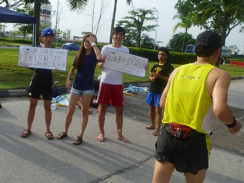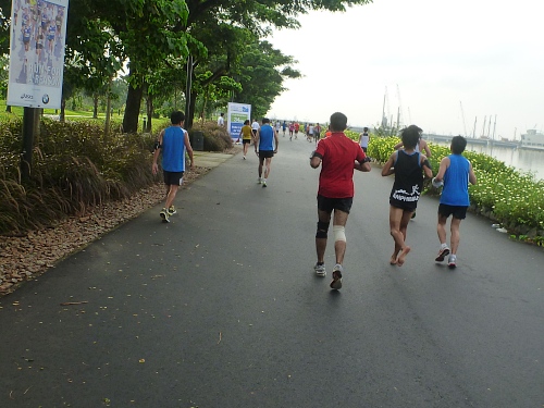 Mal abwarten, ob ich auch die erste Frau ausmachen kann. Der Laufweg trennt sich aber gelegentlich von der Gegenrichtung. An einer Stelle gibt es einen kleinen See mit einer Wasserskianlage. - Wo mag Judith nur stecken? - Ein Läufer spricht mich auf Deutsch an und wünscht mir noch viel Spaß, während er mich zügig überholt. Ich habe mir auf den Rücken ein Schild genäht: „Hello Singapore, Andreas from Munich, Germany“.