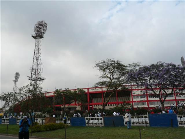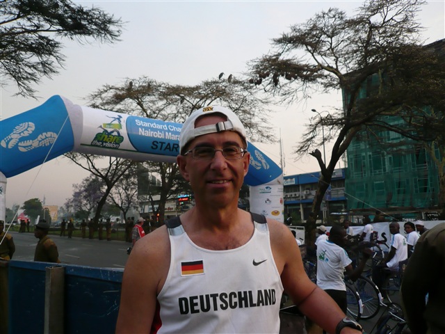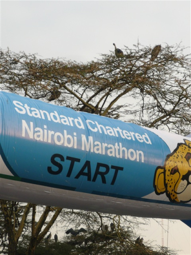 Der Streckenverlauf ist, wie soll ich sagen, nicht unbedingt der Brüller. Es geht zunächst auf einem Rundkurs sternförmig mit mehreren Begegnungsstrecken knapp 10 km nach Norden durch einige große Straßen der Innenstadt, dann auf dem ebenfalls für den Fahrzeugverkehr gesperrten Nairobi-Mombassa-Highway je zweimal 15 km (2 x 7,5 km) auf und ab in Richtung Südosten und zurück, bevor der Zieleinlauf ins Stadion erfolgt. Ich bin überrascht, daß doch einige Weiße mitlaufen, damit hatte ich nicht gerechnet. Die meisten sind junge Leute, offensichtlich Mitarbeiter von Hilfsorganisationen. Über dem Startbogen haben es sich in einem Baum aasfressende Marabus (große Vögel) gemütlich gemacht. Es wirkt so, als warteten sie quasi geierhaft bereits darauf, einige postmarathonale Leichen schnellstmöglich zu entsorgen. Ich freue mich, den Trainer „meiner“ Athleten zu sehen, einige von ihnen starten heute über diverse Distanzen, zwei im Marathon.