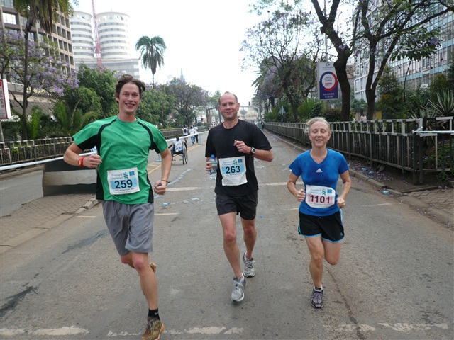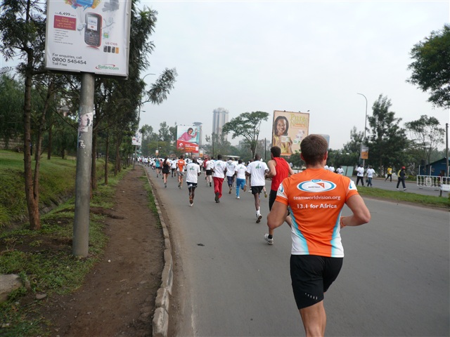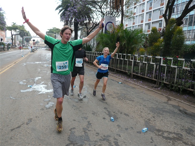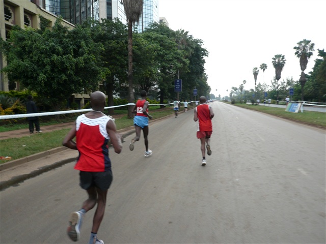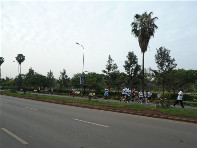 Noch in der Innenstadt begegnet mir das zahlenmäßig große Feld der Führenden erneut. Ich versuche, mit einigen bedeutenden Gebäuden ein paar nette Fotos einzufangen, ansonsten ist das Bild aus der Sicht eines Germanen doch eher trist. Natürlich ist es für die Hiesigen ungewohnt, daß so ein weißer Depp zwischendurch knipst und dazu auch mal stehenbleibt, aber sie haben ihren Spaß daran und so locke ich den einen oder anderen doch aus der Reserve. Einige km laufe ich mit drei Weißen zusammen, einem Holländer und zwei Aussis. Ich bin froh, ein wenig Ablenkung zu haben und auch mal plaudern zu können. So komme ich sogar an ein Bild, auf dem ich selber zu sehen bin. Dem mitlaufenden Kenianer mache ich deutlich, daß ich heute unbedingt wenigstens einen Schwarzen hinter mir lassen muß und halte ihn kurzzeitig an der Schulter fest. Schön, daß er den Spaß versteht und mitmacht.
