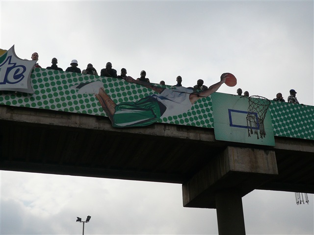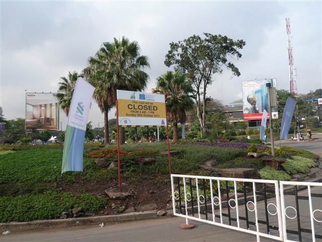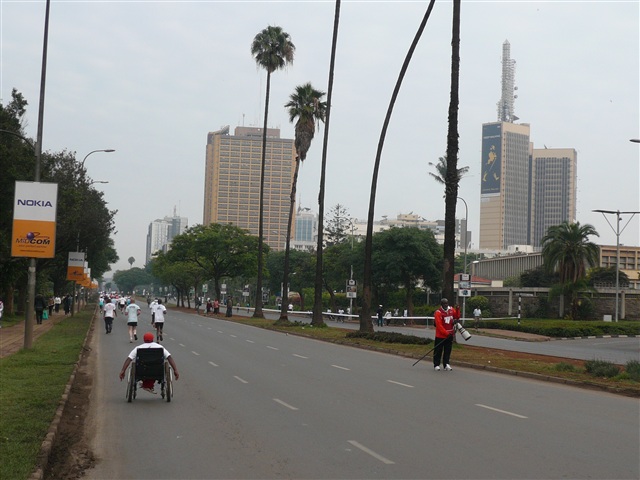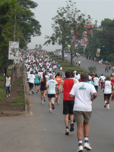 Einige durchaus bemerkenswerte Gebäude an den Straßenrändern, so z.B. der Regierungssitz als das höchste der Stadt machen deutlich, daß Stadt und Land zwar aufstrebend sind, sie zeigen aber auch gleichzeitig die extremen Gegensätze, die hier zu verzeichnen sind. Wir passieren eine Tankstelle, die Spritpreise sind für unser Verständnis mit umgerechnet 80 bis 90 Cent niedrig, gemessen an einem kenianischen Einkommen jedoch sehr hoch. Nach knapp 10 gelaufenen km kommen wir wieder am inzwischen etwas verwaist wirkenden Startbereich vorbei, der sich aber schon bald bei der Startaufstellung zum Halbmarathon wieder füllen wird. Bei der Unterquerung eines Fußgängerüberwegs über den Highway amüsieren sich die dort stehenden Schaulustigen über den sie knipsenden Verrückten. Die starken sozialen Gegensätze kann am Straßenrand beobachtet werden: Einerseits finden Umzüge mit von Menschen gezogenen Karren statt, andererseits werden direkt dahinter chromglänzende Karossen feilgeboten.