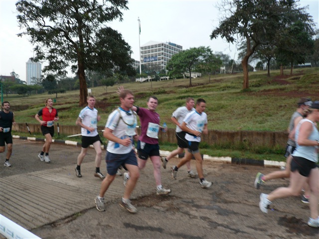 Unter einem Konfettiregen erfolgt pünktlich um 7 Uhr der Startschuß. Ich wundere mich immer wieder über mich selbst. Ich, der ich Morgenläufe hasse wie die Pest, nehme das im Rennen ganz locker und bin auch wach. Schon bald geht es eine ordentliche Steigung hinauf, geschätzte 150 Höhenmeter werden insgesamt wohl zusammengekommen sein. Wir streifen den Uhuru-(Freiheits-)Park, eine seltene grüne Oase in der für mich wenig attraktiven Stadt. Die erste Wasserstelle, die übrigens ca. alle 3 km stehen, kommt für mich schon nach einer guten Viertelstunde, man gibt es in geöffneten Drittelliterflaschen aus. Das ist es dann aber auch schon mit der Verpflegung, mehr gibt es nicht. Ich habe zur Sicherheit zwei Gels in meiner Gürteltasche dabei, man ist ja schließlich vorbereitet
