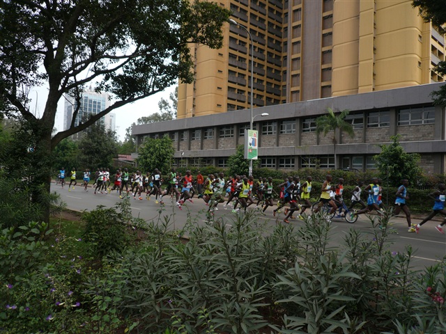 Noch bevor ich zum ersten Mal trinken kann, rauscht erstmals der Keniaexpress vorbei, und zwar ortstypisch in Bataillonsstärke, einige Tricycles in halsbrecherischem Tempo dazwischen. Meine Fresse, haben die alle ein Tempo drauf! Nicht, daß Ihr meint, hier ginge es um nichts, weit gefehlt. In allen Kategorien gibt es Preisgelder zu gewinnen. Im Marathon z.B. erhält der Erste 150.000 KES, der Zehnte noch 10.000 KES, und dafür lohnt es sich, die Beine in die Hand zu nehmen. Das ist hier richtig gutes Geld. Nach der ersten Steigung scheint mein Puls in Ordnung zu sein, die Beine sind locker, die neuen 195 g-Schlappen ein Gedicht. Inwieweit sechs Tage ausreichend sind, mich an die ungewohnte Höhe von 1.600 m ü. NN zu gewöhnen, wird sich zeigen. Dazu später mehr.