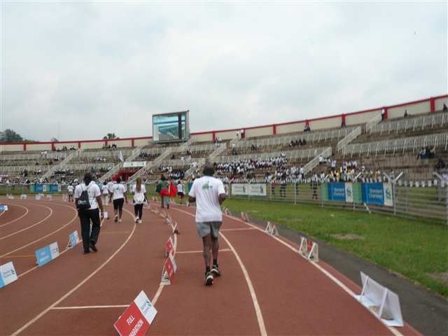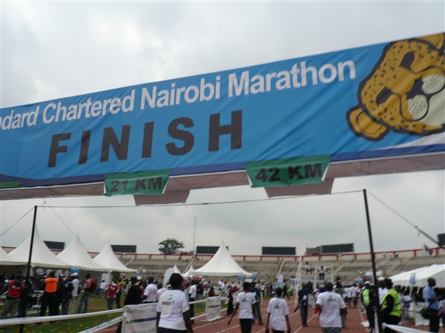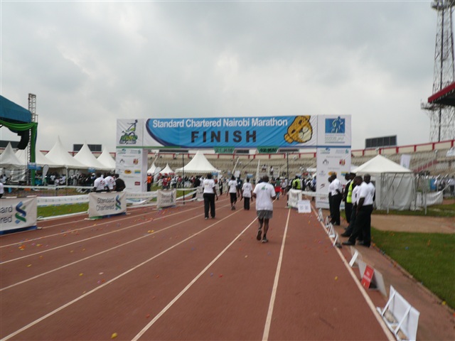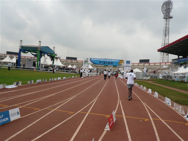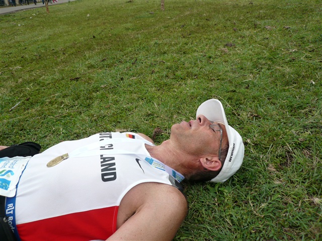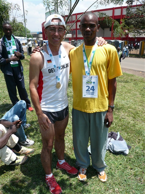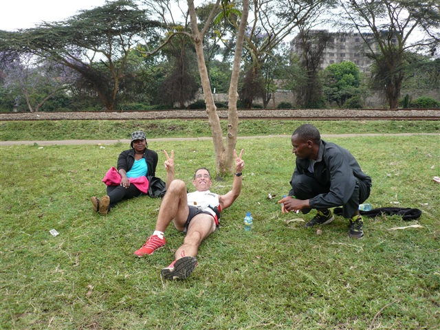 Ganz langsam humpeln wir gemeinsam, Josephs Elizabeth an meiner Hand, aus dem Stadion. „Stop, Medal Ceremony!“ befiehlt Joseph und ich kann für die Kamera äußerlich tatsächlich noch einmal entspannt wirken. Außerhalb des Stadions mit der einzigen Tartanbahn Kenias ist dann aber erst einmal Ende mit der Selbstbeherrschung, völlig apathisch verbringe ich die nächsten Minuten in der Horizontalen. Schon wieder nur dieses Sch…wasser!