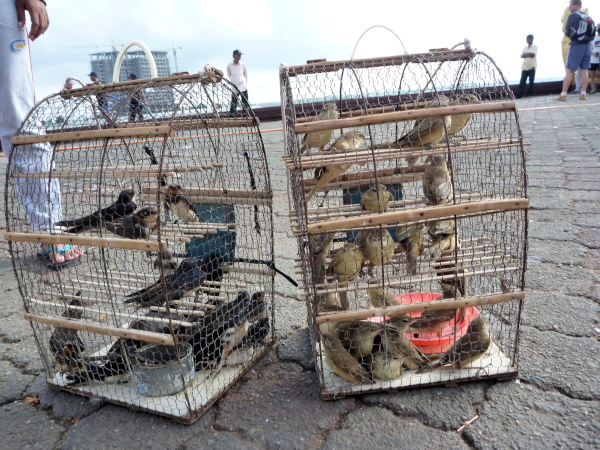 Stadtrundgang: Die Orientierung in Phnom Penh ist einfach, die Straßen sind alle durchnummeriert, was nicht hilft, denn es gibt keine Straßenschilder. An der Mündung des Tonle Sap Flusses, der seit letzter Woche wieder abwärts fließen darf, schwimmen Inseln aus Wasserhyazinthen vorbei. Man kauft kleine Vögel und lässt sie fliegen, das soll Glück bringen.