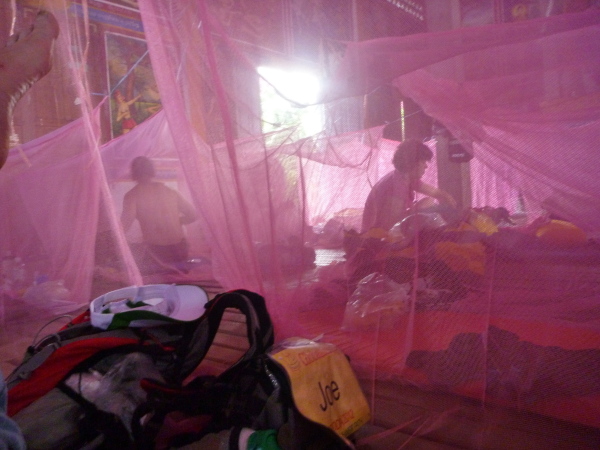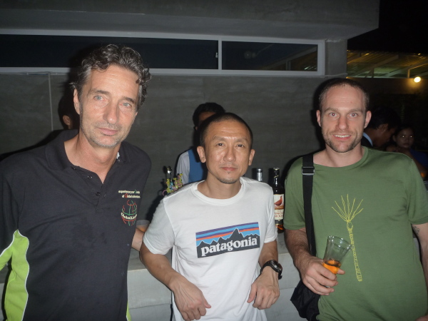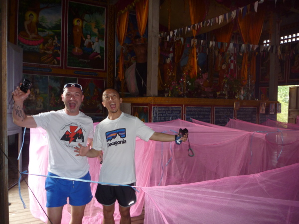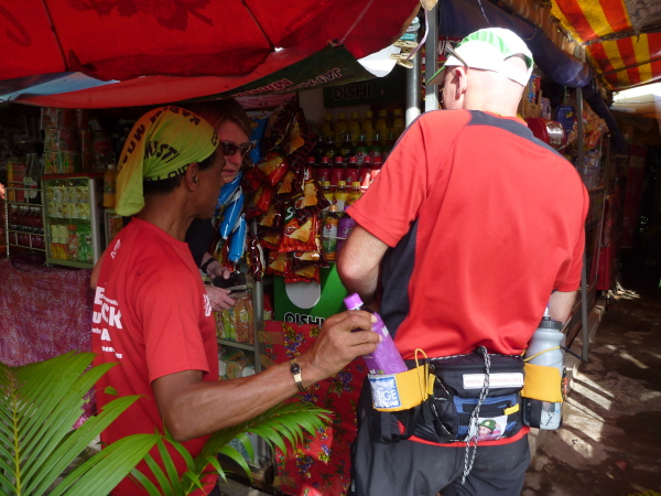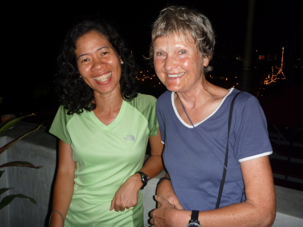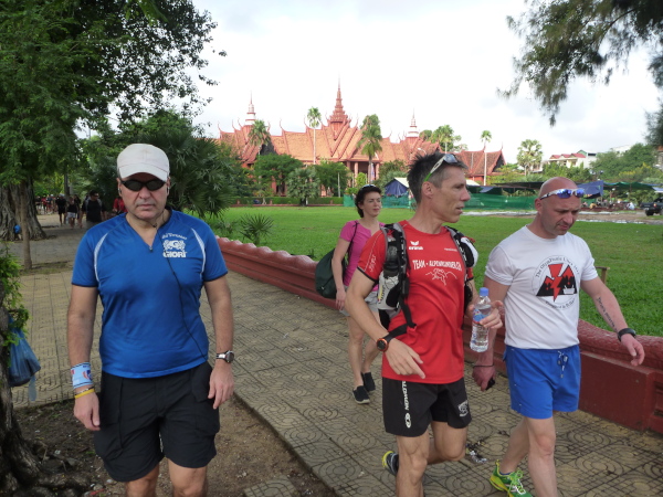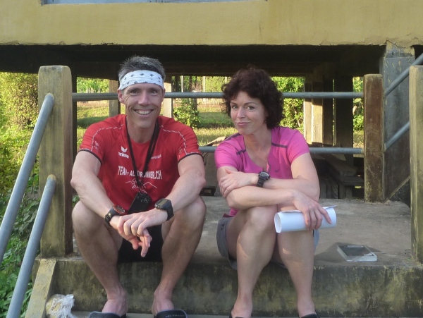 29 Läufer aus 14 Nationen treffen im Laufe des nächsten Tages ein, checken sich auf Konkurrenzfähigkeit ab. Die Spitzenläufer sind uns allen bekannt. Vor allem ich muss mir, wohl wegen meiner Carbo-Polster, zweifelnde Fragen anhören. Auffallend ist auch Sophie Power, die in ihrem langen englischen Kleid eher in den Film “Jenseits von Afrika” passt. Diese gutaussehende Läuferin ist anscheinend ziemlich prominent und wird von einem kanadischen Kamerateam begleitet. Auffallend auch Daniel aus der Schweiz, der ein 20 kg- Kanu auf dem Rücken trägt. Er wird nach dem Lauf den kompletten Mekong abfahren. Edda beeindruckt mit 68 Jahren. Der Rest der Läuferfamilie passt eher in einen Film über die Fremdenlegion, wenn nicht die Finisher-Shirts anderes erkennen ließe.