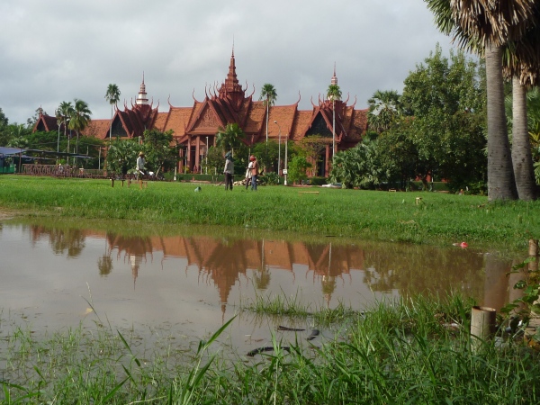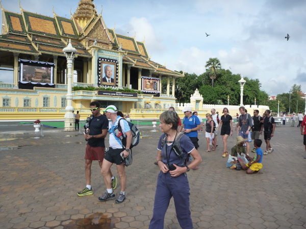 Die Hotelbaustelle liegt direkt neben dem hellerleuchteten Königspalast. Der König ist vor drei Wochen verstorben. Ein Staatsdiener nimmt verbeugend weiße Kondolenz-Lotusblüten entgegen, die am Seiteneingang gleich recycelt werden, in dem sie Weg zurück zu den Blumenverkäufern finden. Währung ist der US-Dollar. Wechselgeld erhält man in Riel, wertlose Scheine, von denen man bald einen ganzen Stapel besitzt.