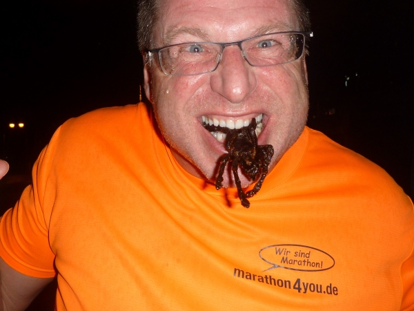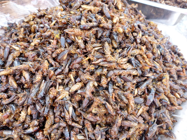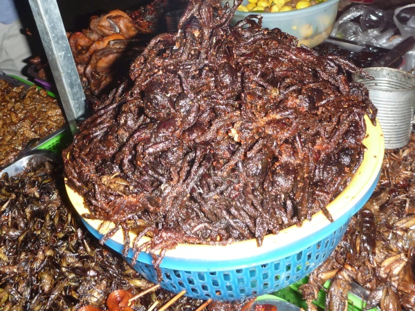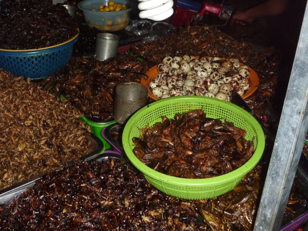 An einer Garküche gibt es Insekten und Spinnen. Nichts Ungewöhnliches in Kambodscha. Die Heuschrecken (Kritters) sind erstklassig. Ich kaufe eine ganze Tüte voll mit den nach Popcorn mit Speck schmeckenden Dingern. Die Puppen irgendwelcher Käfer schmecken dagegen eher knatschig, die handtellergroßen Wasserwanzen haben mir zu viel Panzer, die Spinnenbeine schmecken wie Zahnstocher, der pralle Leib der mit einer süß-salzigen Frittierglasur überzogenen Vogelspinne enthält ein schleimiges Gel aus einer Art Bananencreme. Die gegrillten Schlangen (Wassertrugnatter) stammen aus dem Tonle Sap See, dessen gleichnamiger Abfluss hier in der Hauptstadt in den Mekong mündet.