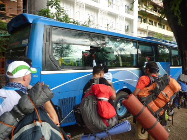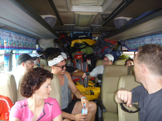 Am nächsten Morgen wird es Ernst: Gepäck in den Bus, der uns zum ersten Camp fährt und kurzer Stadtrundgang. Auffallend hier Jag und Arwind, zwei der fünf Inder, die figurmäßig hervorstechend sind. Die fünf Inder kennen sich aus Militärzeiten und machen nun jedes Jahr Extremläufe. Ein tolles, lustiges Team mit exzellenten Kochkünsten und Whisky im Gepäck. Das Gepäck ist auf 10 kg begrenzt, muss Nahrung für 6 Tage (12.000 kcal Minimum), Schlafsack und Matte beinhalten.