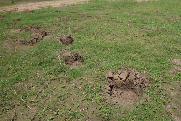 Das zerrissene Zusammenspiel zwischen Land und Wasser ist abwechslungsreich und fordert höchste Trailleidenschaft. Es geht über Felsen, durch Sumpf, dornige Büsche und riesige Grasflächen. Es fehlt eigentlich nur noch der T-Rex. Und dann sehe ich tatsächlich seine Spuren: Monsterspuren, letzte Nacht tief eingedrückt in der da noch nassen Erde. Aus allen Richtungen ziehen diese Spuren zu einer flachen Stelle im See: Elefantenspuren. In Botswana hat ein Elefant meinen wohlgefüllten Beercooler als Fußball benutzt. Ich bin anschliessend fast verdurstet. Das ist kein Scherz. Ich würde jetzt ein Vermögen für ein kaltes Getränk zahlen.