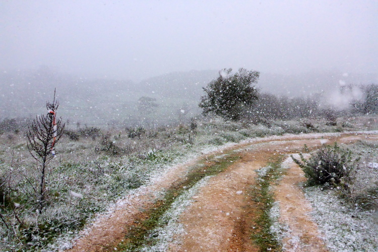 Es ist jetzt so hell, dass ich den Berg hinter mir sehe. Er ist tatsächlich weiß. Die folgende Stunde ist angenehm. Es regnet wie Sau, die Wege sind Bäche - aber was kümmert mich das? Der folgende Berg hat auch nur eine Höhe von 350 Metern, aber es beginnt wieder dichtes Schneetreiben. Jetzt wird es mir zu viel. Tief gebückt, mit einer blanken Hand ziehe ich die Kaputze ins Gesicht. Ja, die Kaputze habe ich nur gefunden, weil der Wind sie mir nach vorne geblasen hat.