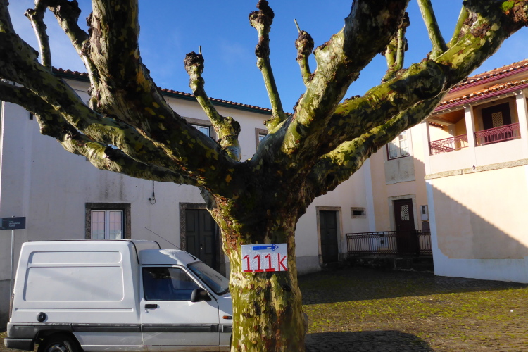 In Podentes verirre ich mich, laufe zweimal im Kreis. Der Regen geht in Schnee über, waagerechter Schnee! Auf einer Landstrasse suche ich den Weg. Die Markierung ist top, wirklich top, überall Refektoren und alle 5 Meter Markierungsband. Aber mein IQ ist stark gesunken. Ich muss zurück, weit zurück. Meine Stirnlampe will nicht mehr.